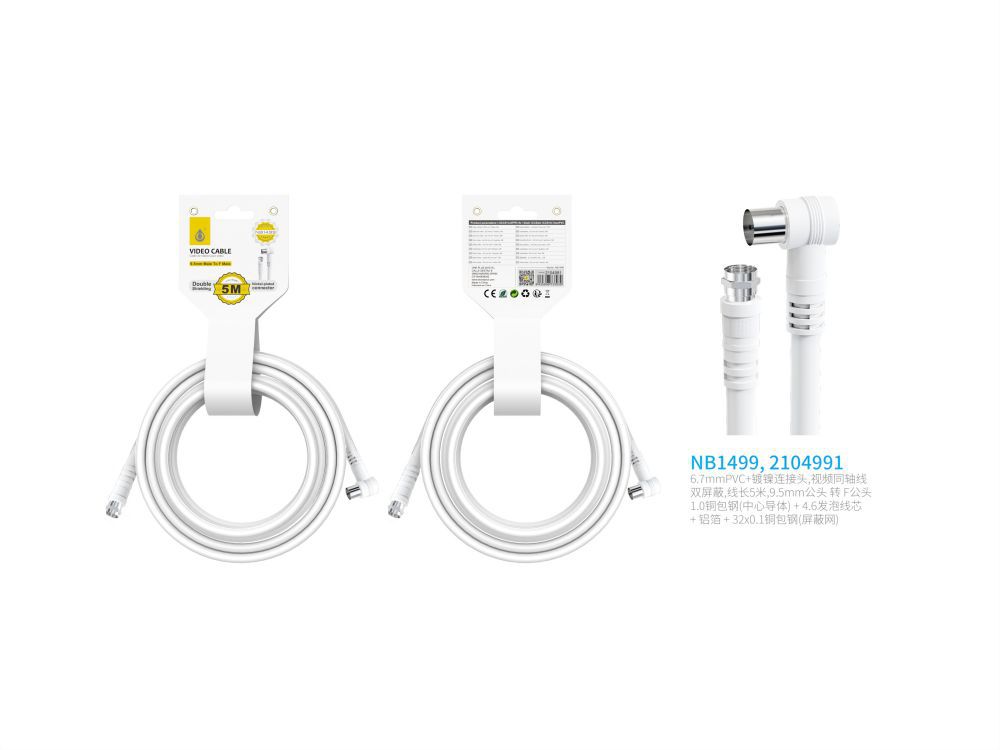 NB1499  Cable de Video(Coaxial) Conector banado en niquel 9.5mm Macho a Conector F Macho, doble blindaje, 5 Metro, Blanco