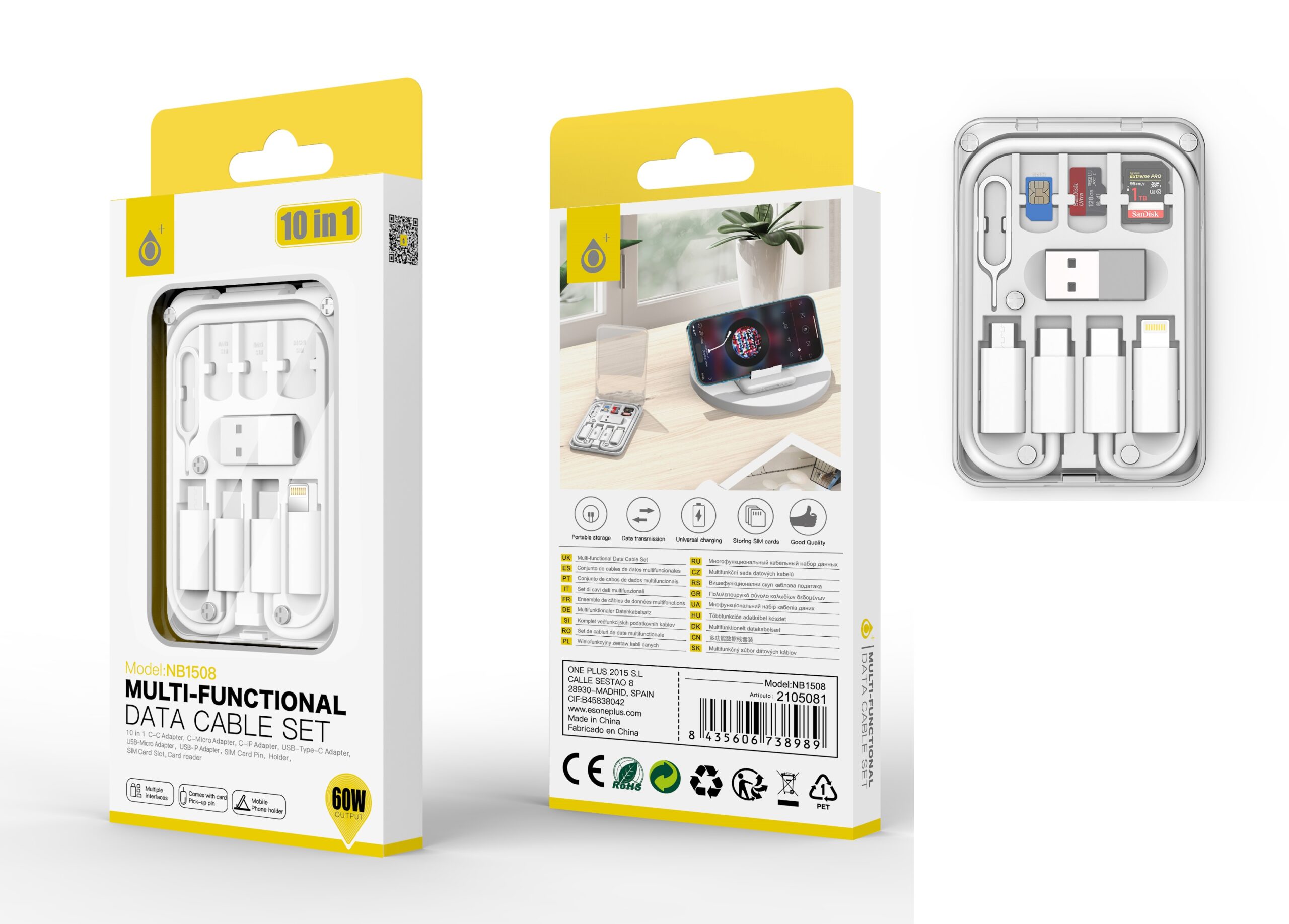 NB1508 BL Kit de Cable y Adaptadores de Movil con Funcion de Soporte y almacenaje de tarjetas, 60W Max, Blanco