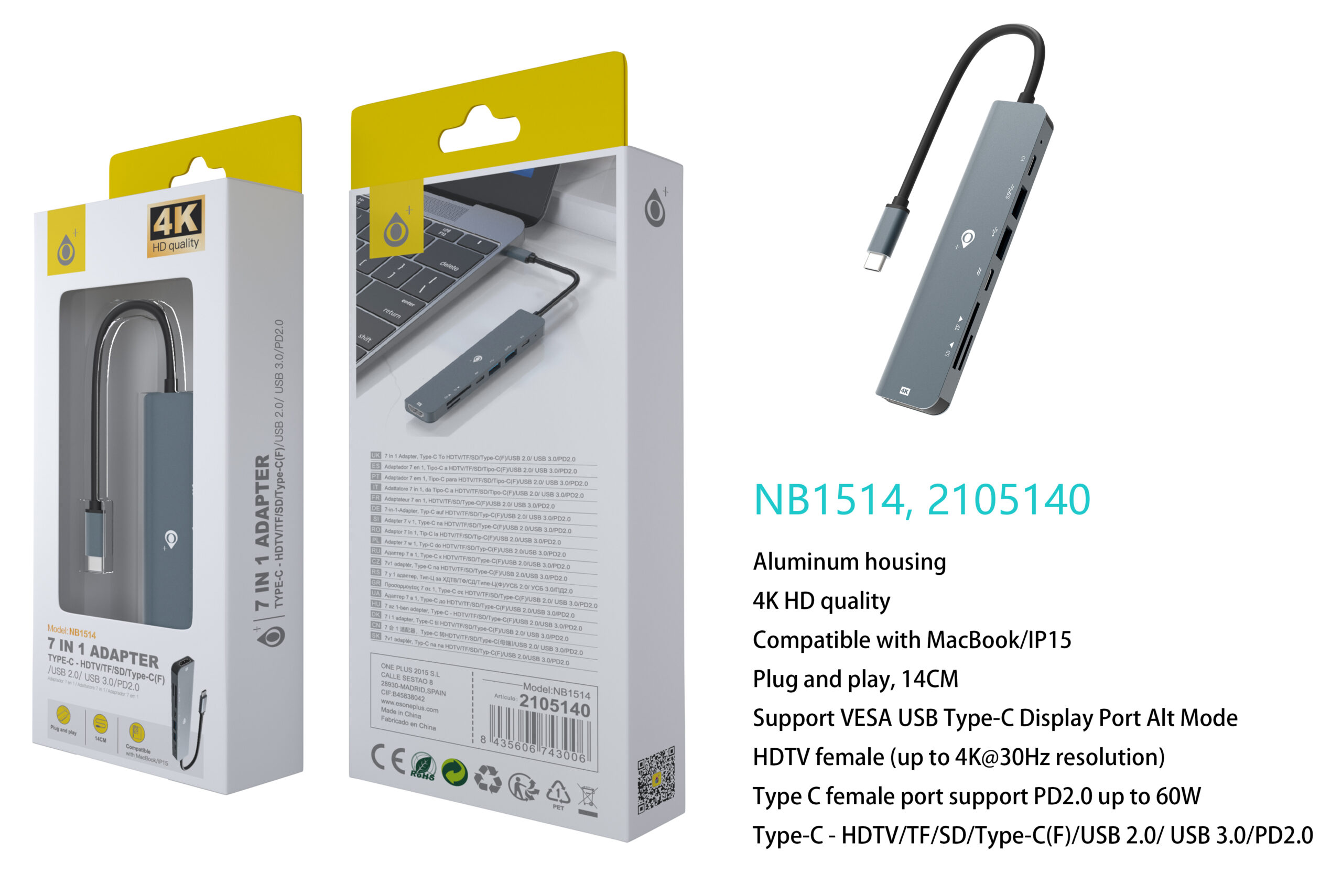 NB1514 GS lector TYPE-C Hub 7 en 1, HDMI/TF/SD/Type-C/USB2.0/USB 3.0/PD 2.0 Compatible con Apple Type-C, Gris