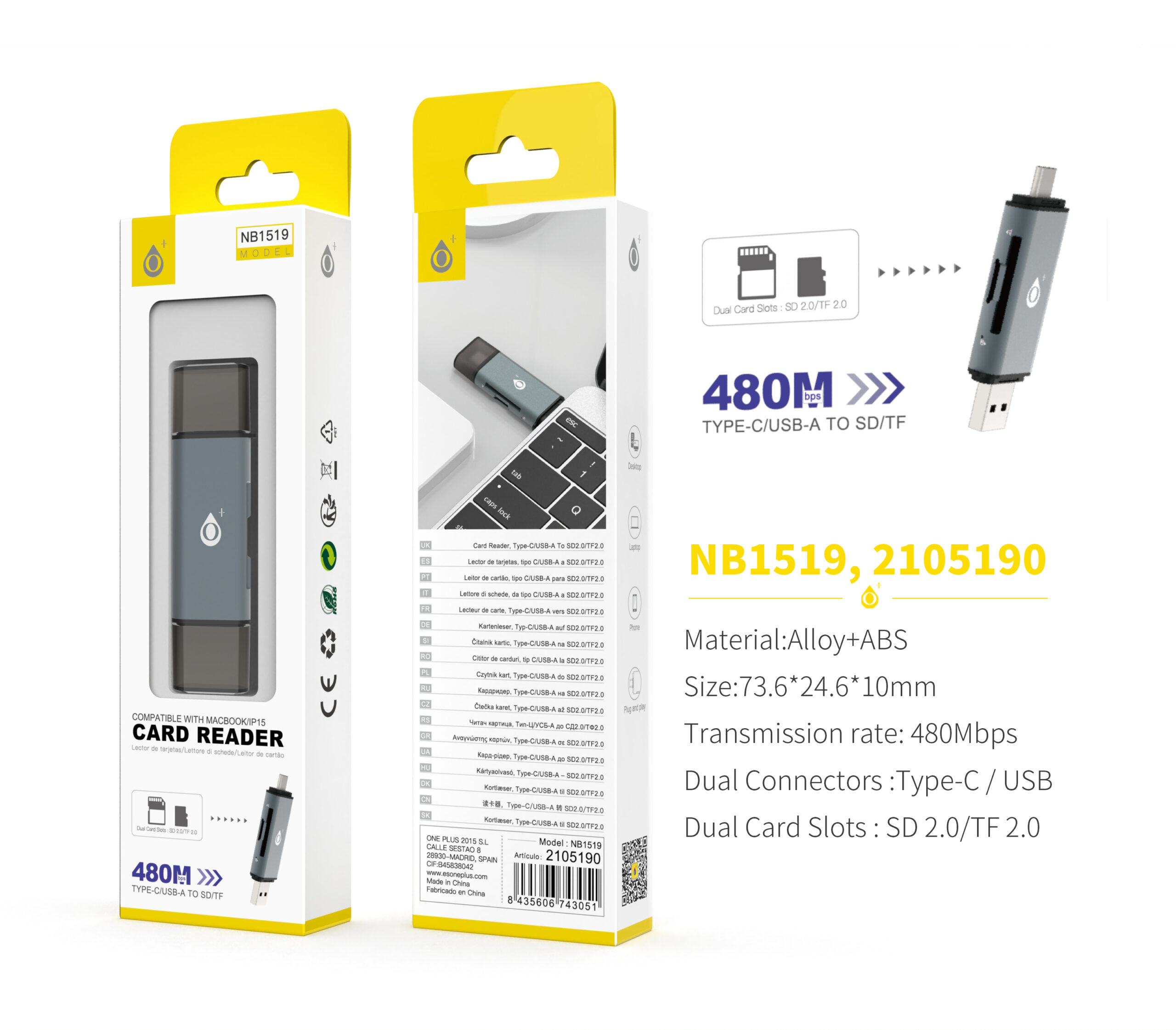 NB1519 GS Lector de tarjeta con doble conector USB/Type-C para SD/TF, 480Mbps, Gris