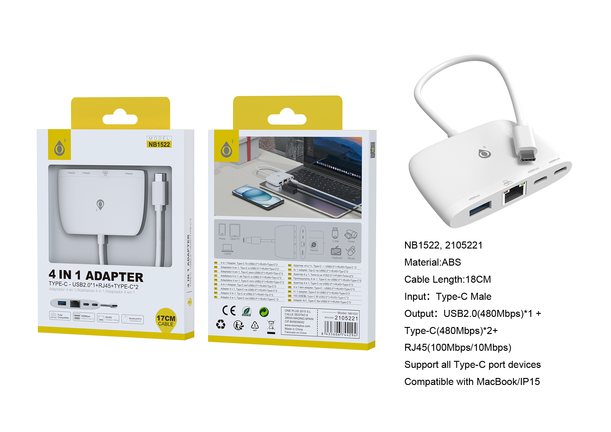 NB1522 BL Adaptador USB-C 4 en 1, USB-C (Macho) a RJ45/USB 2.0/USB-C*2 (Hembra), Compatible Apple, Blanco