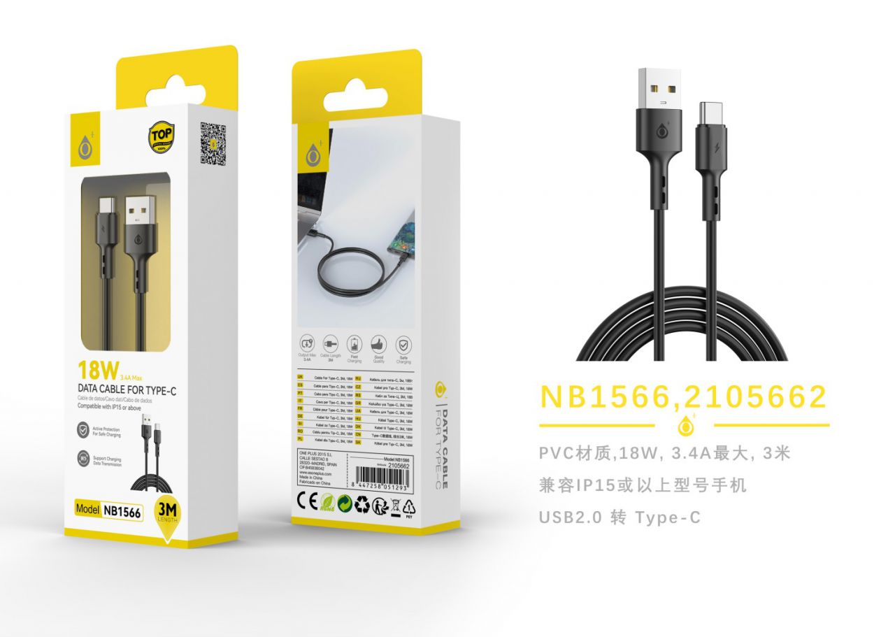NB1566 NE 18W/3.4A Cable de datos fonti para Type-C, 3M, Negro