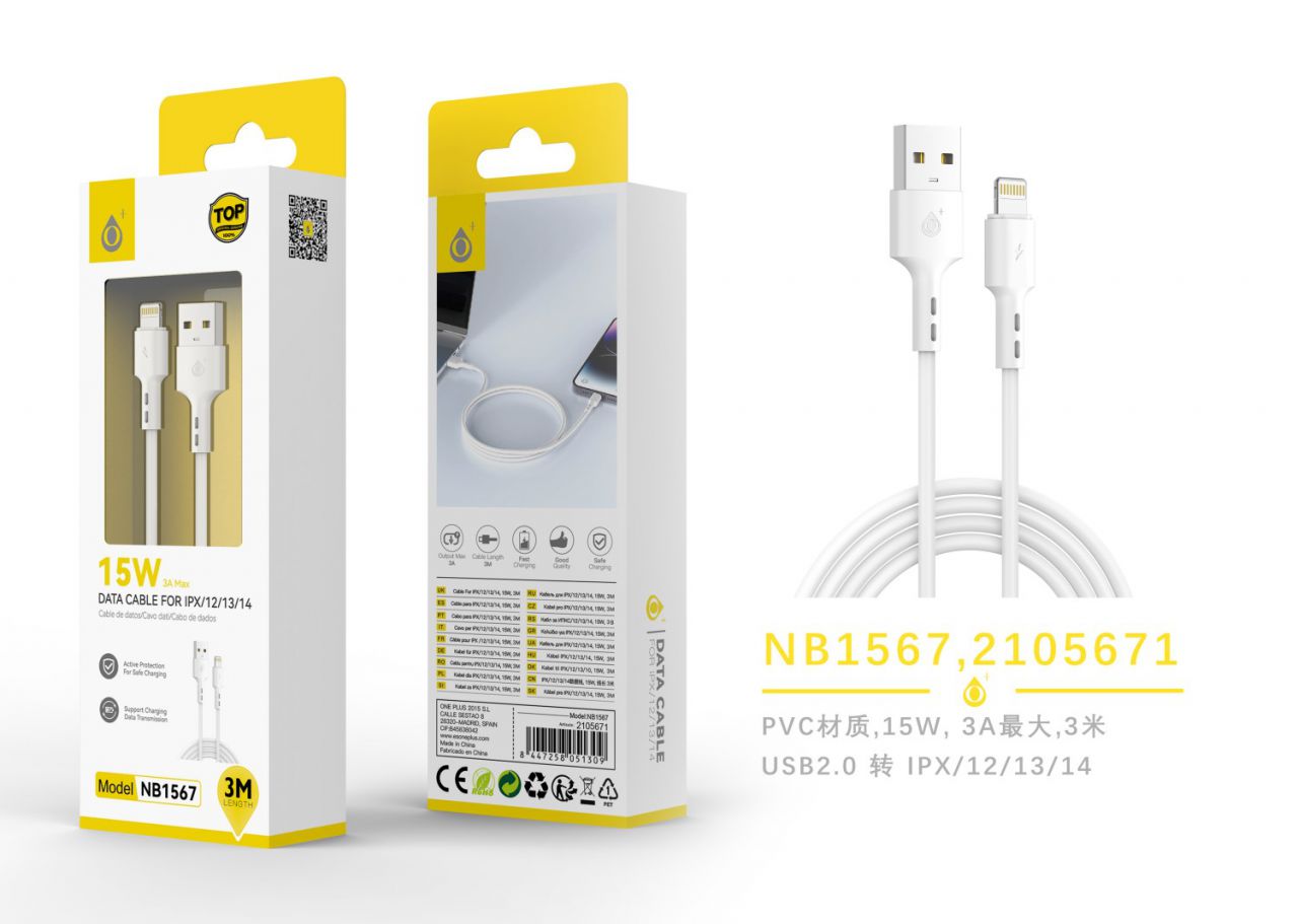 NB1567 BL 15W/3A Cable de datos fonti para Iphone 5-14, 3M, Blanco