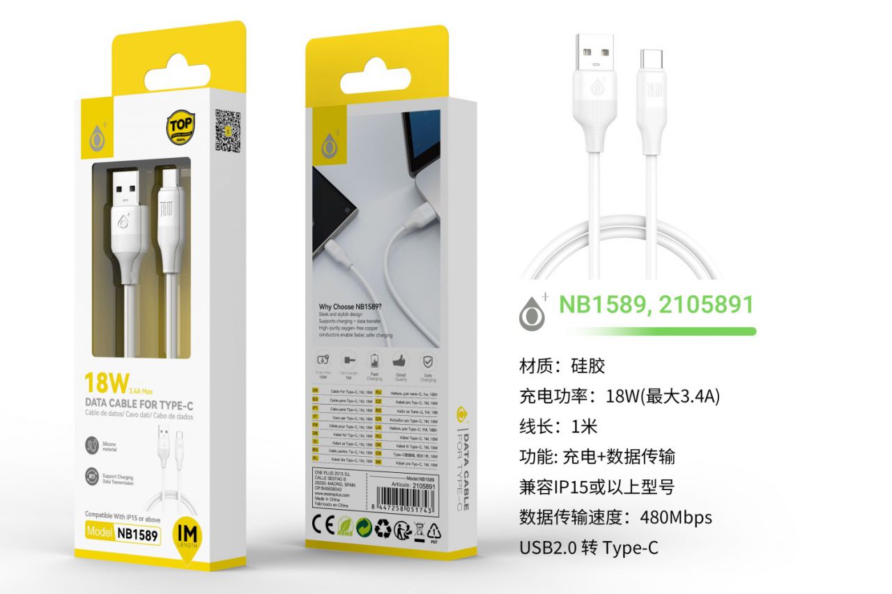 NB1589 BL 18W/3.4A Cable de datos Filero de silicona de silicona para Type-C, 1M, Blanco