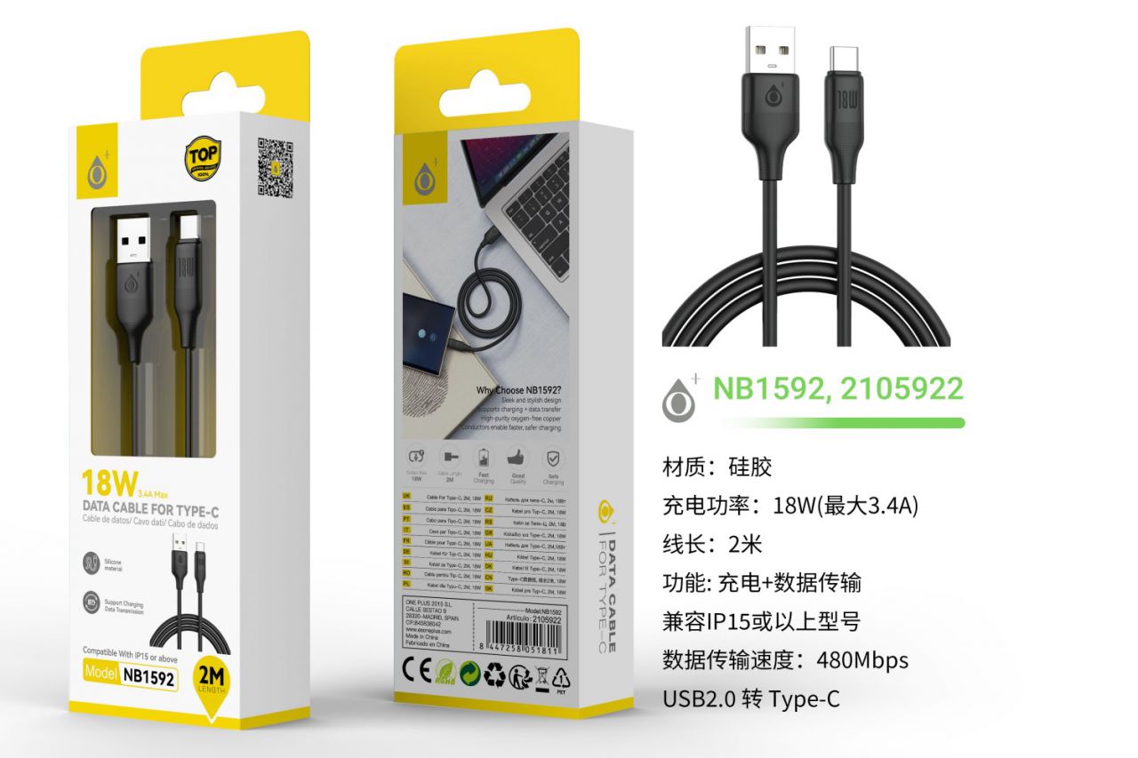 NB1592 NE 18W/3.4A Cable de datos Filero de silicona  para Type-C, 2M, Negro