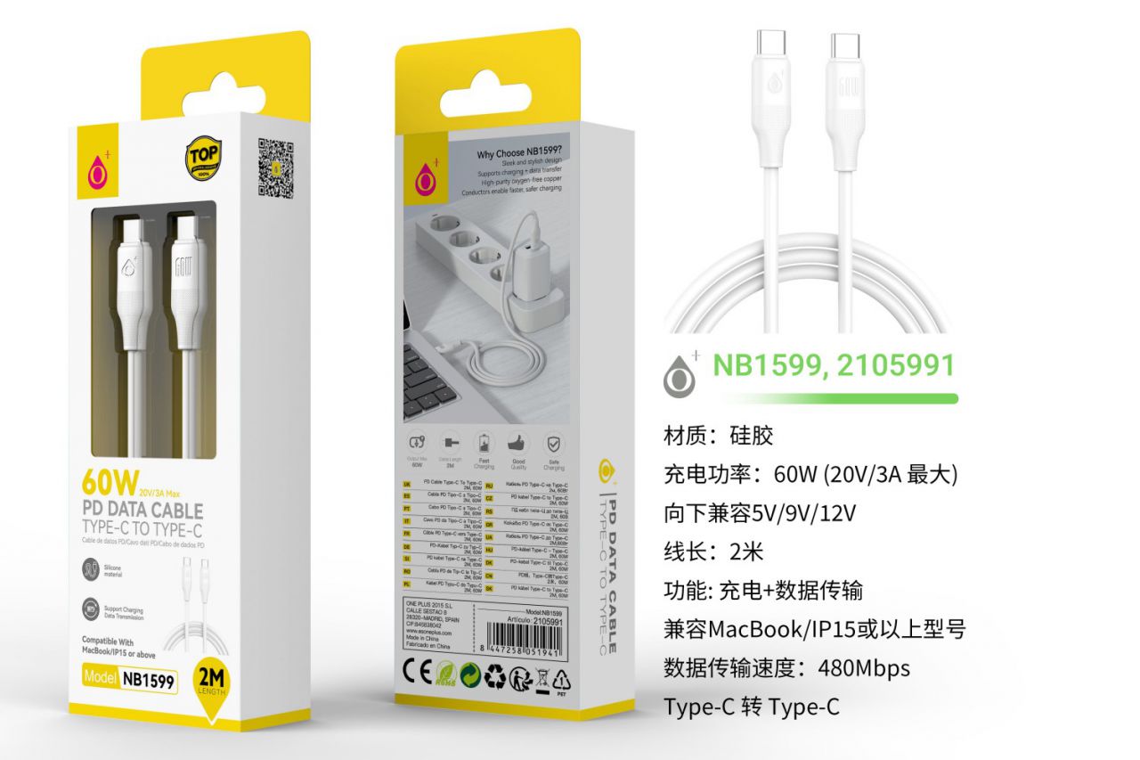 NB1599 BL Cable de Datos Filero de silicona Type-C a Type-C, Carga rapida PD 60W/20V/3A, Cable 2M, Blanco