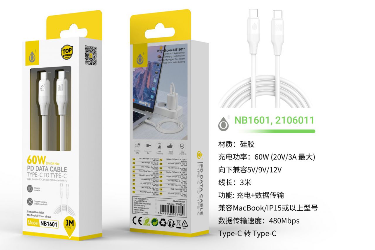 NB1601 BL Cable de Datos Filero de silicona, Type-C a Type-C, Carga rapida PD 60W/20V/3A, Cable 3M , Blanco