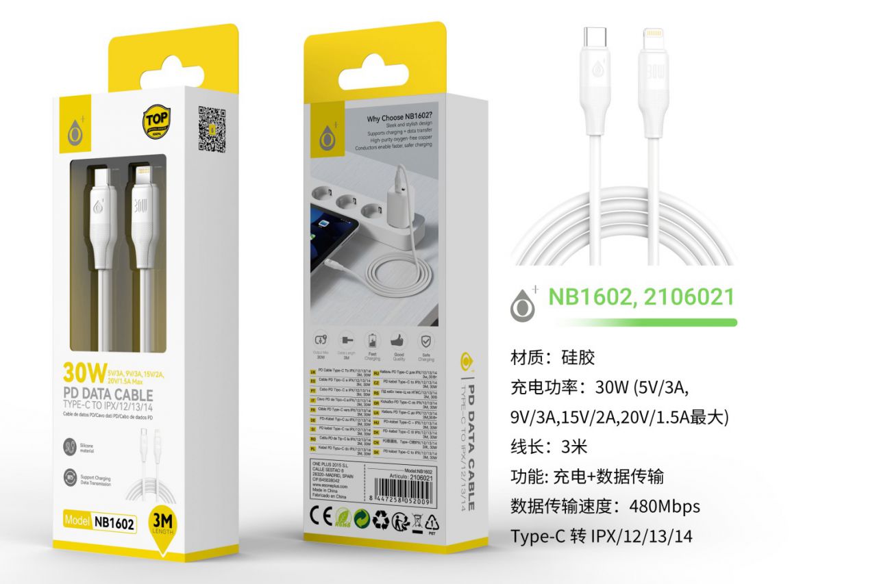NB1602 BL Cable de Datos Filero de silicona, Type-C a Iphone, Carga rapida PD 30W/20V/1.5A, Cable 1M , Blanco