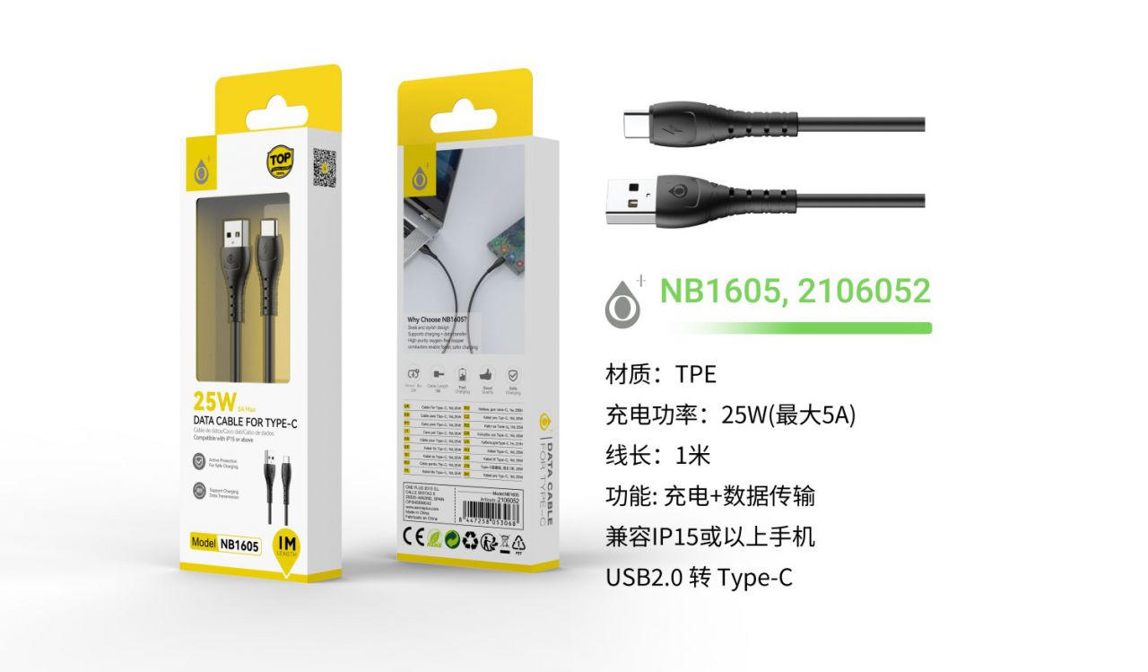 NB1605 NE Cable de Datos Limi Type-C, Carga rapida 25W/5A,Cable 1M, Negro