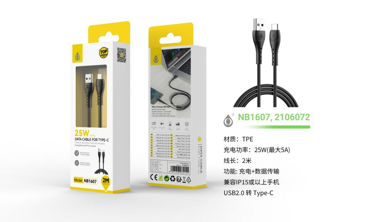 NB1607 NE Cable de Datos Limi Type-C, Carga rapida 25W/5A,Cable 2M, Negro