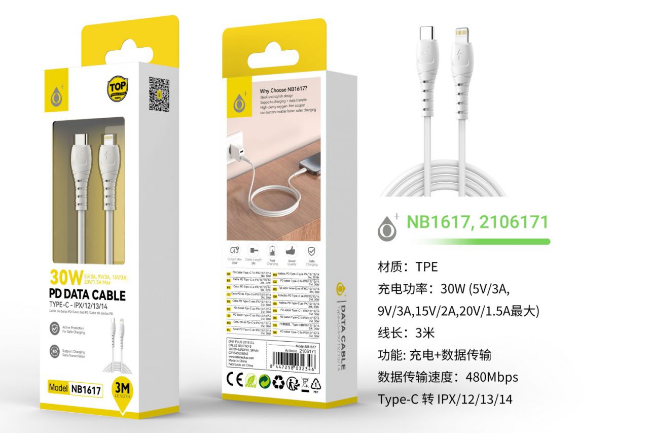 NB1617 BL Cable de Datos Limi Type-C a Iphone, Carga rapida PD 30W/20V/1.5A, Cable 3M, Blanco