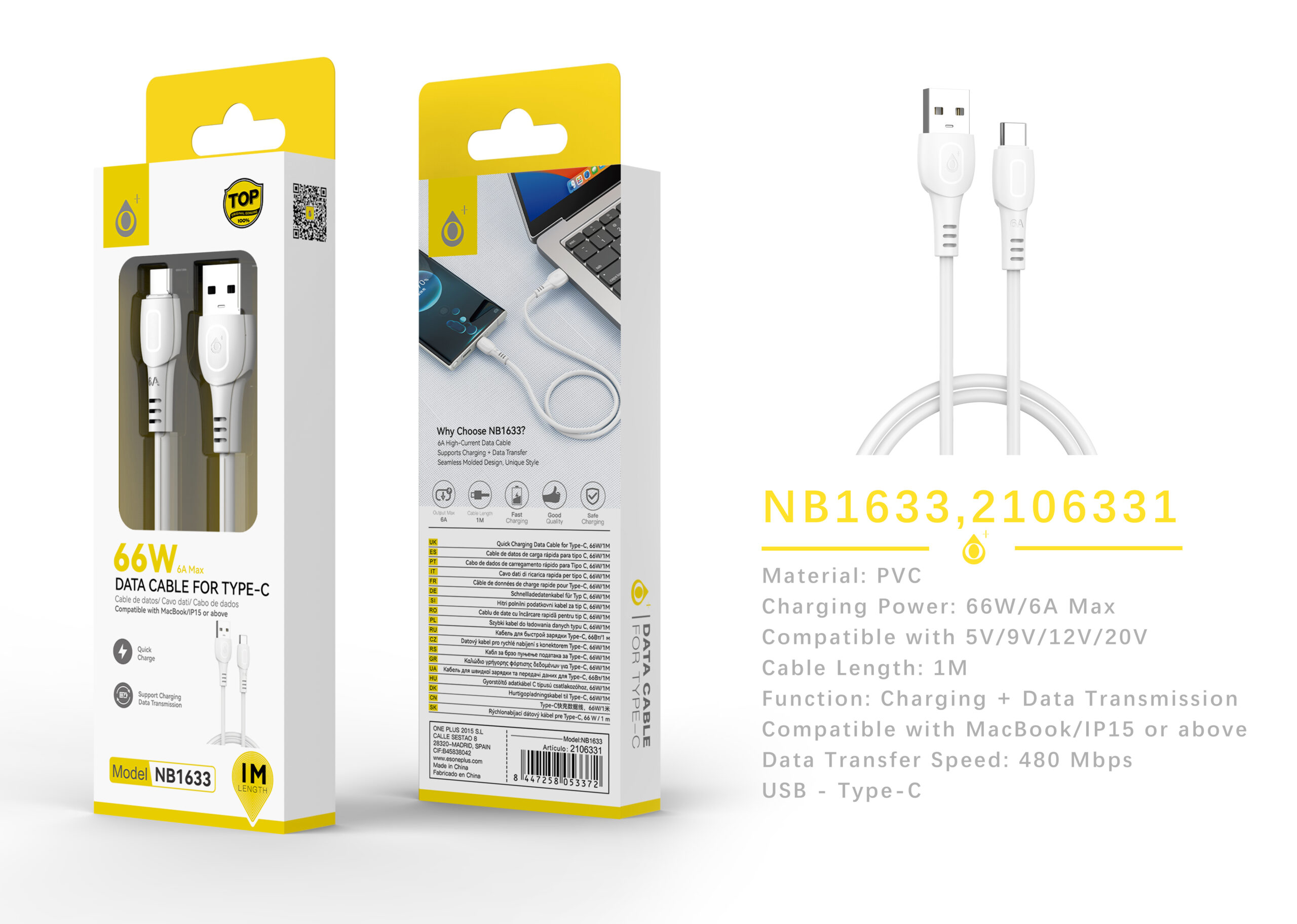 NB1633 BL Cable de Datos Felo Type-C, Carga rapida 66W/6A, Cable 1M, Blanco