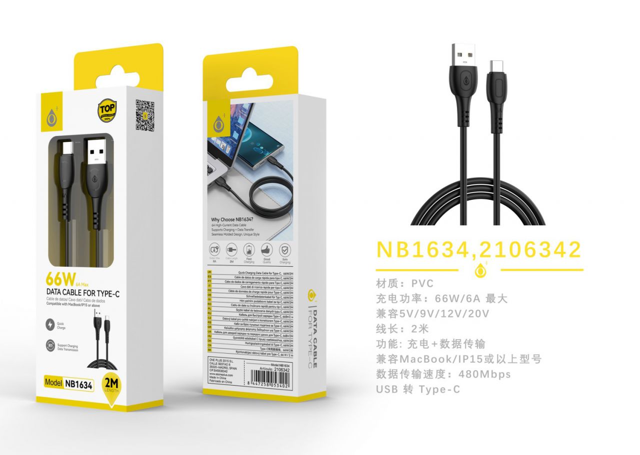 NB1634 NE Cable de Datos Felo Type-C, Carga rapida 66W/6A, Cable 2M, Negro