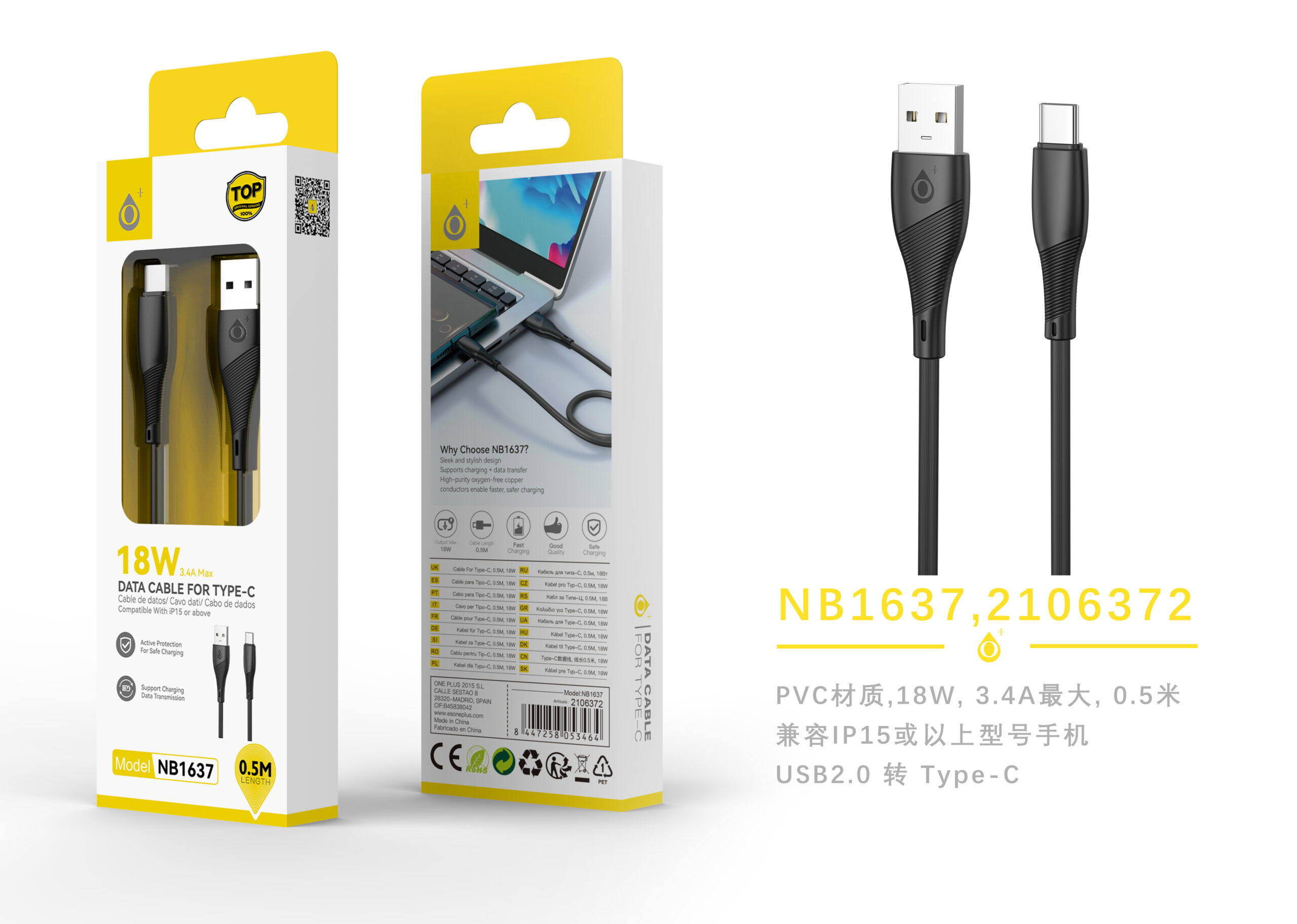 NB1637 NE 18W/3.4A Mini Cable de Datos Walsh para Type-C, Cable 0.5M, Negro