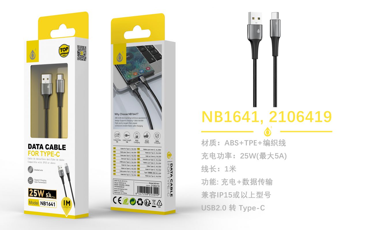 NB1641 GR Cable de datos Rom trenzado con luz LED para Type-C, 5A/25W/1M, Gris