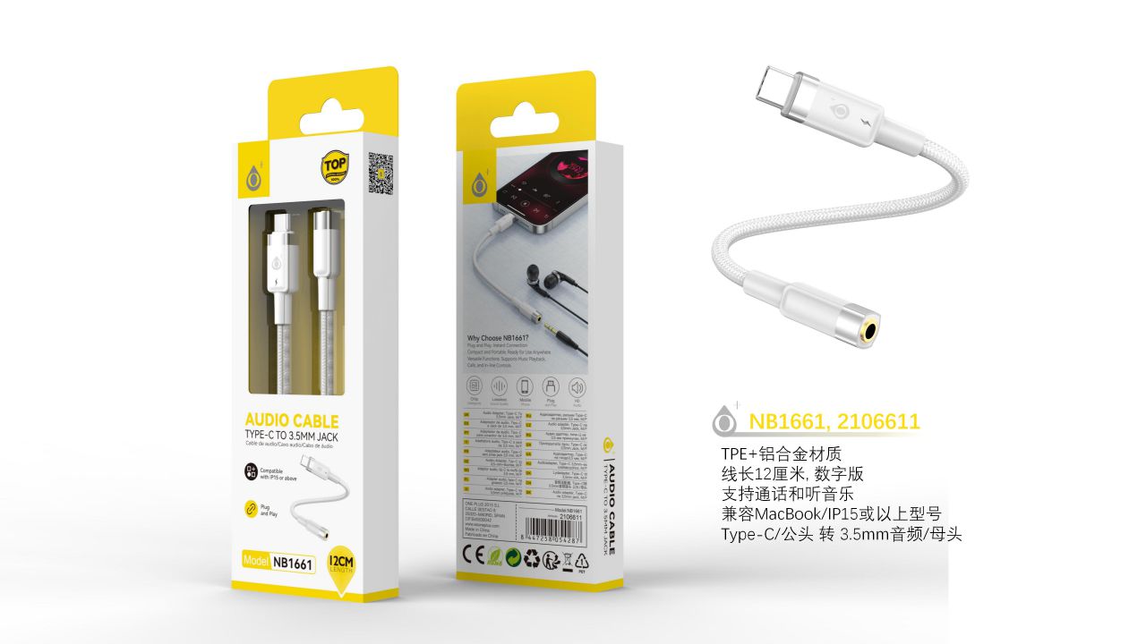 NB1661 BL Adaptador de audio digital con cable aluminio trenzado, Type-C a Jack 3.5mm, Soporta llamada y Musica, 12CM, Blanco
