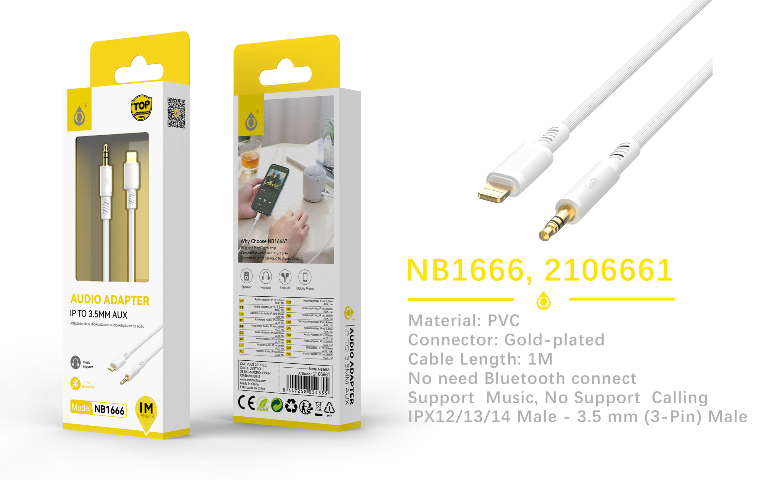 NB1666 BL Adaptador de audio, Lightning(Macho) a 3.5mm(Macho),Plug and play, 1M, Blanco
