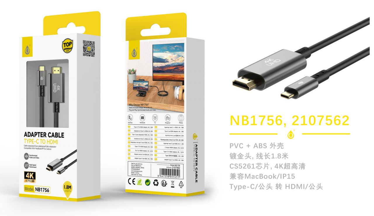 NB1756 NE Adaptador 4K Type-C(Macho) a HDMI(Macho),  Cable 1.8M, Negro