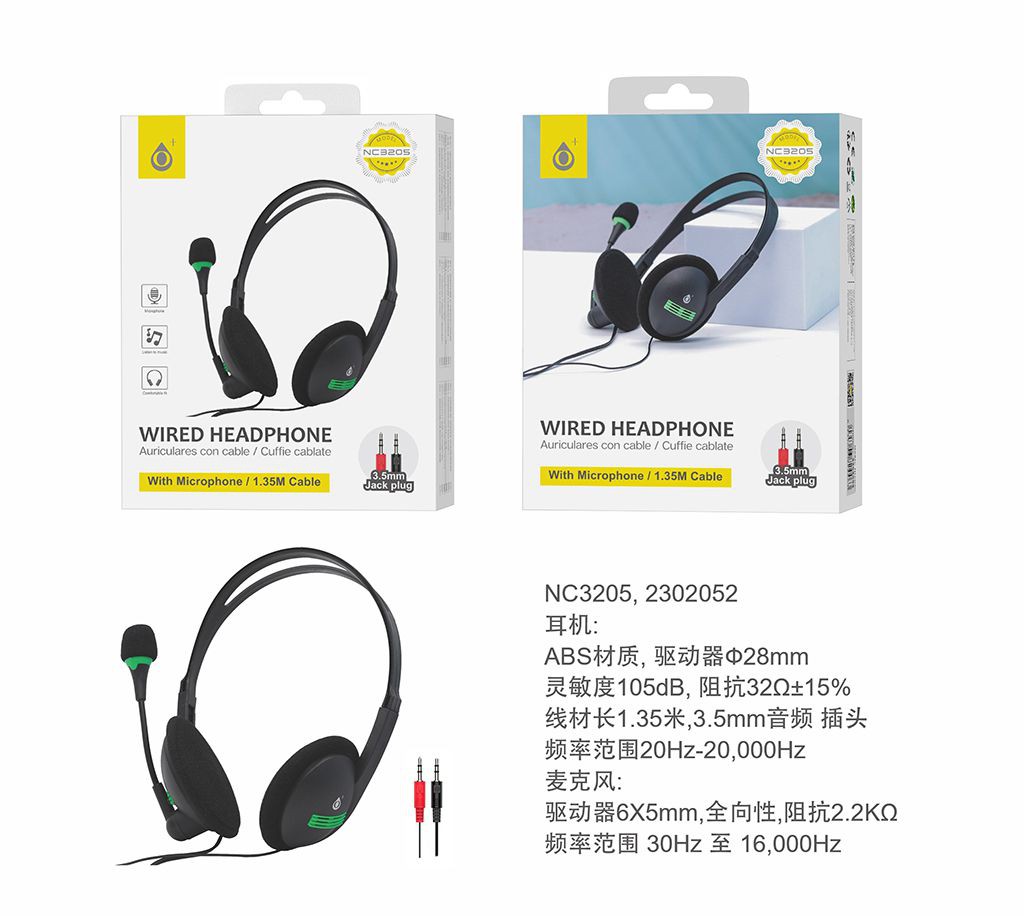 NC3205 NE  Auriculares Cascos con Cable 1,35M y Microfono, 3.5mm Jack Plug,
