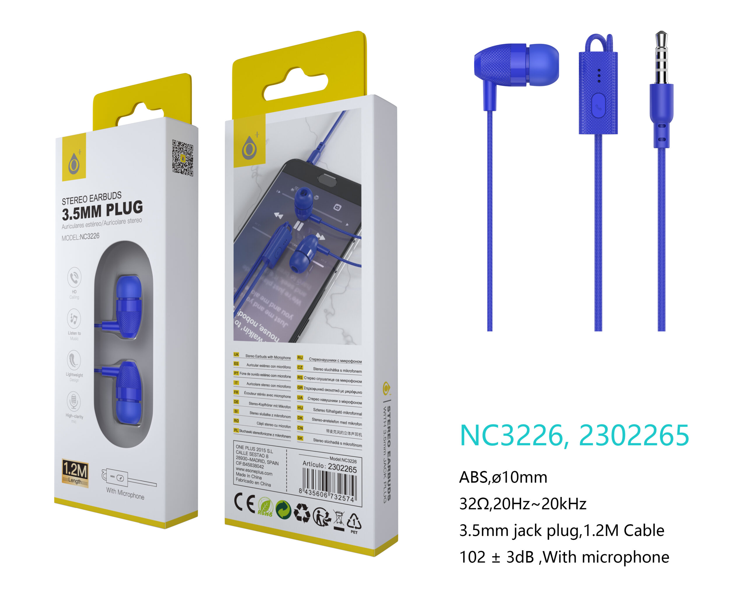 • NC3173 AZ Auriculares con Microfono de alta calidad Namdi,Boton Multifuncion y Control Volumen, Longitud 1.16M,Azul