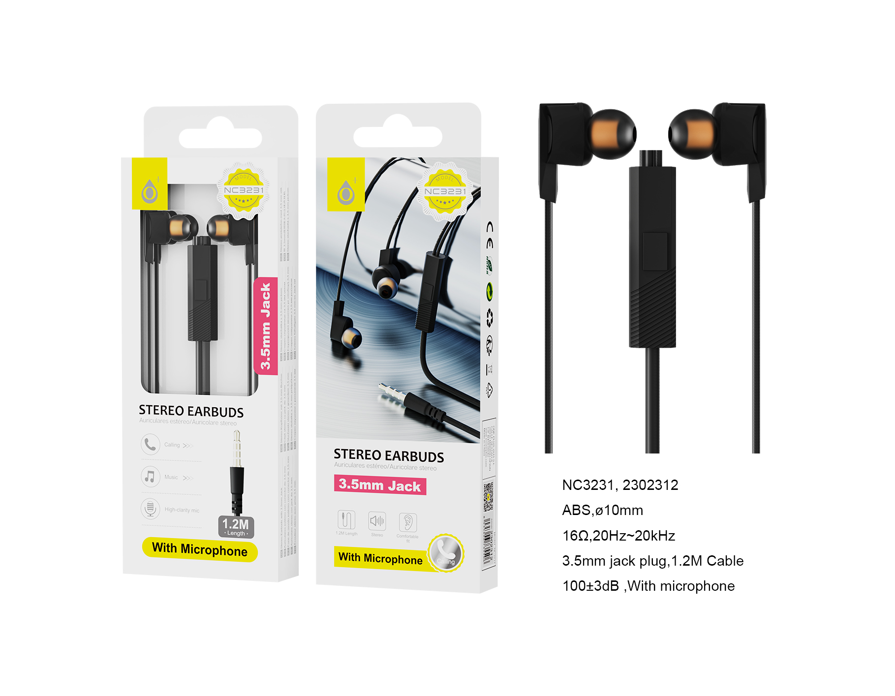 • NC3189 AM Auriculares Ava ,con Microfono, Soporta Control de Volumen y Boton multifunciones, 1.2m,