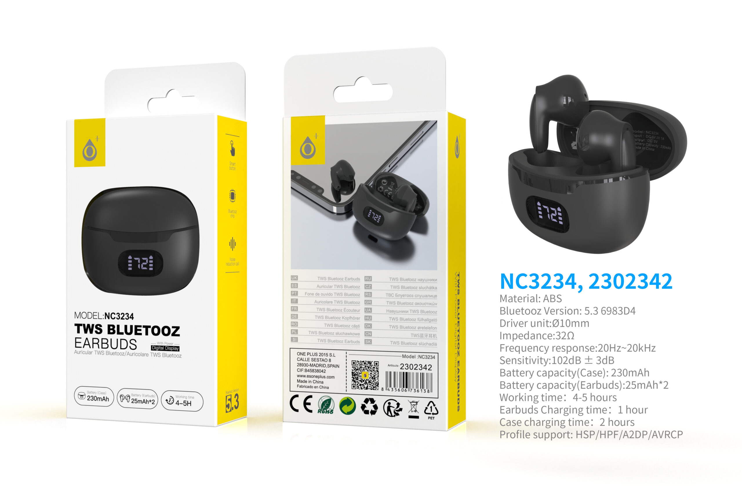 NC3234 NE Auriculares TWS Bluetooth 5.3  Bateria (25mAh*2) con estuche cargable(230mAh), Negro