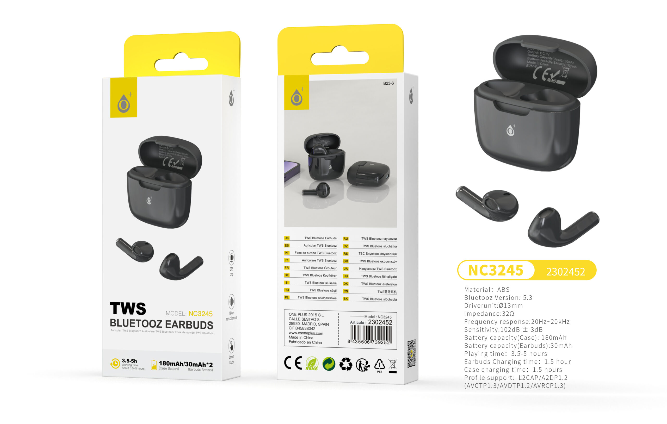 NC3245 NE  Auriculares TWS Bluetooth 5.3, Bateria de auricular (30mAh*2)Con Estuche Recargable 180mAh, Negro