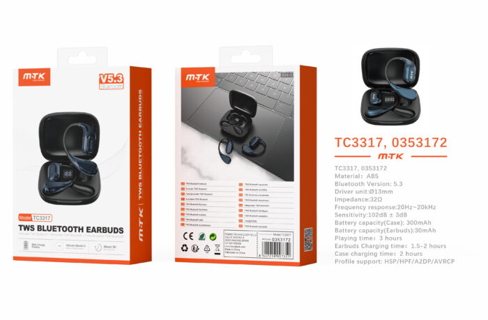 • TC3317 NE+AZ Auriculares TWS Bluetooth 5.3 con indicador de bateria, Bateria (30mAh*2) con estuche cargable(300mAh), Negro+azul