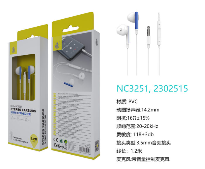 NC3251 AZ Auricular Ria con Microfono y  Control de Volumen, Soporta llamada y Musica, Cable 1.2m, Azul