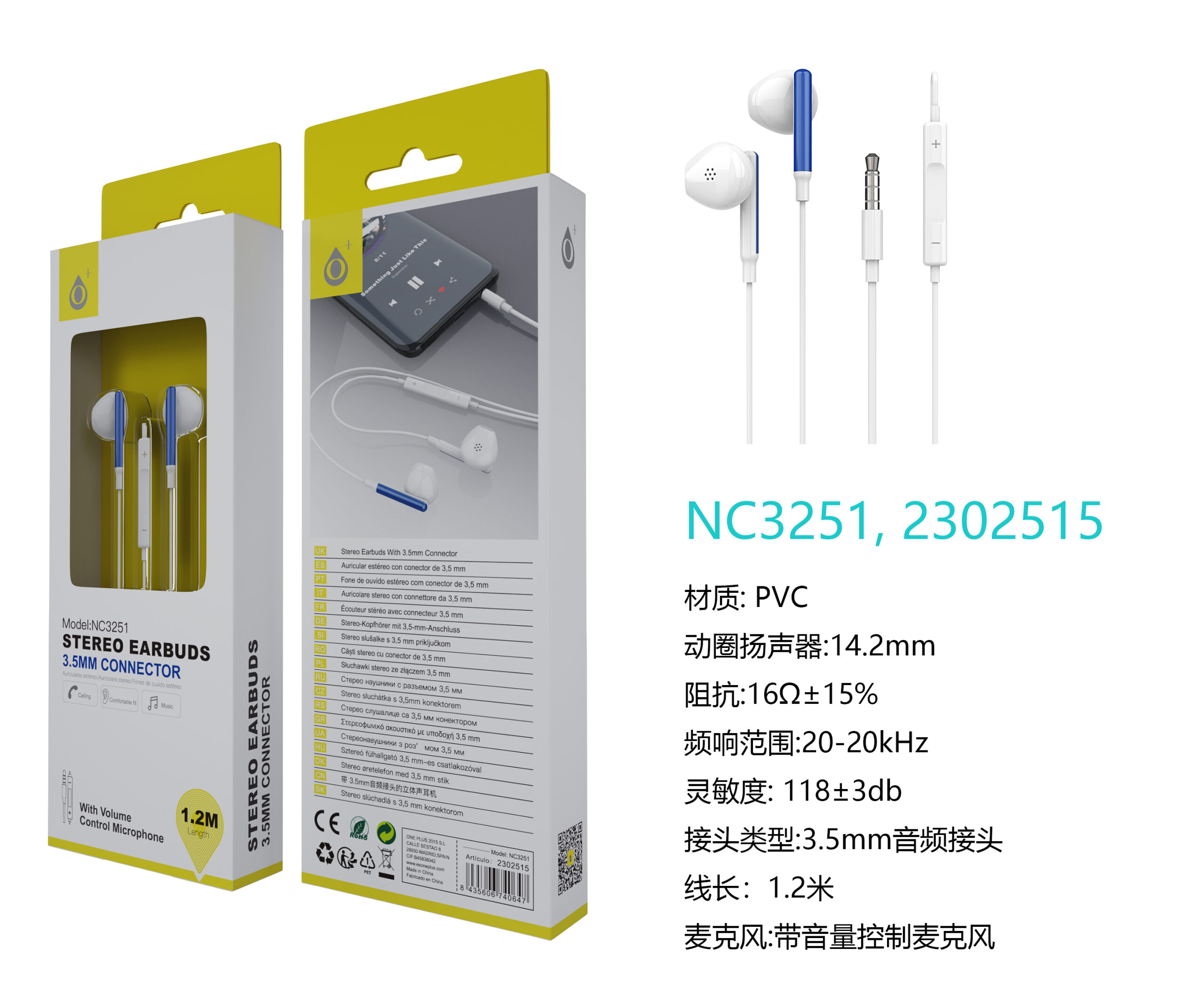 • NC3189 AZ Auriculares Ava ,con Microfono, Soporta Control de Volumen y Boton multifunciones, 1.2m,