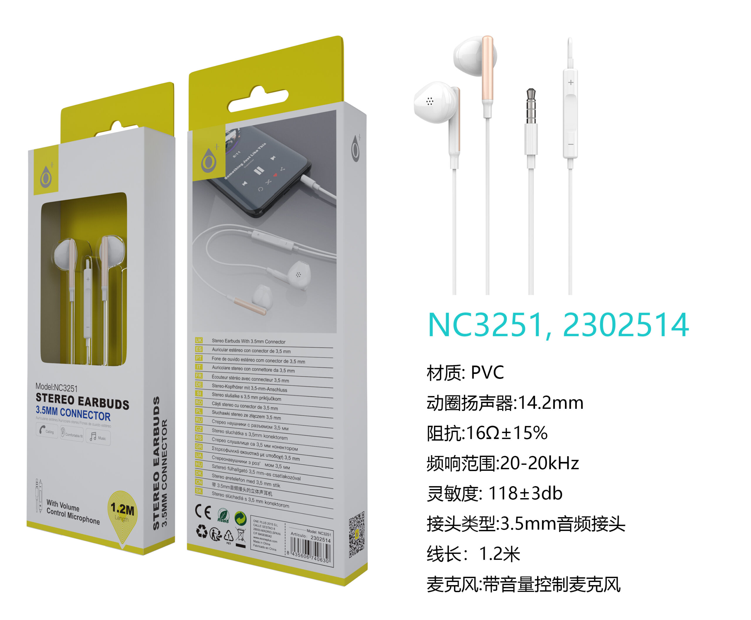 • NC3189 NE Auriculares Ava ,con Microfono, Soporta Control de Volumen y Boton multifunciones, 1.2m,