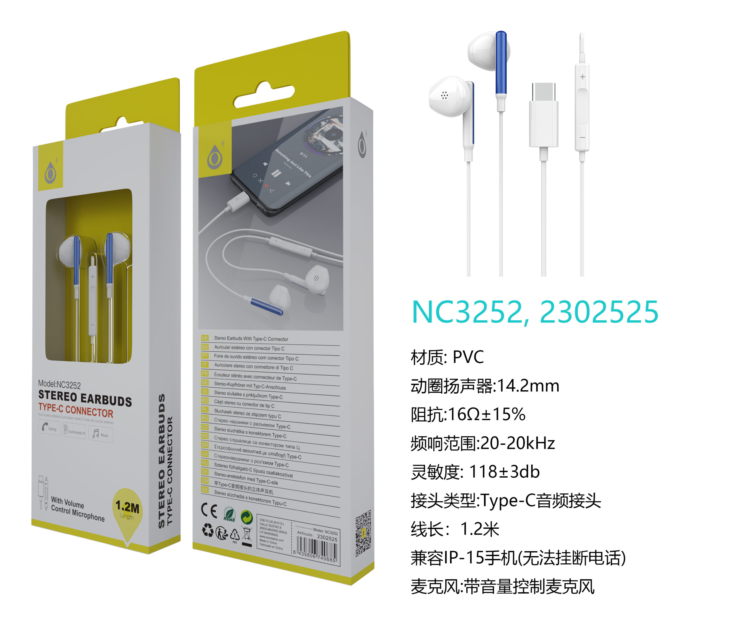 NC3252 AZ Auricular TYPE-C Ria con Microfono y Control de Volumen, Compatible con Apple Type-C, Soporta llamada y Musica, Cable 1.2m, Azul