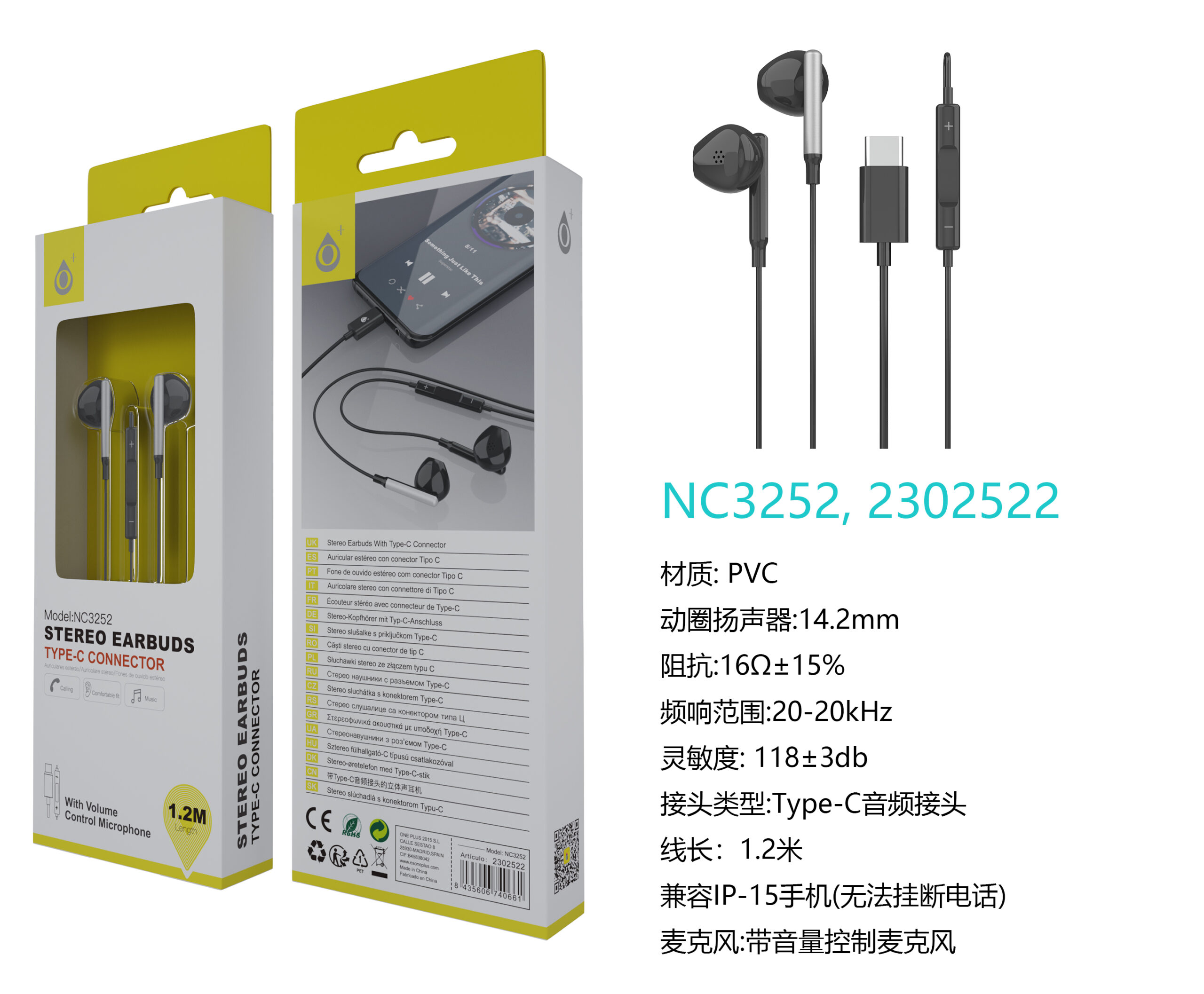 NC3252 NE Auricular TYPE-C Ria con Microfono y Control de Volumen, Compatible con Apple Type-C, Soporta llamada y Musica, Cable 1.2m, Negro