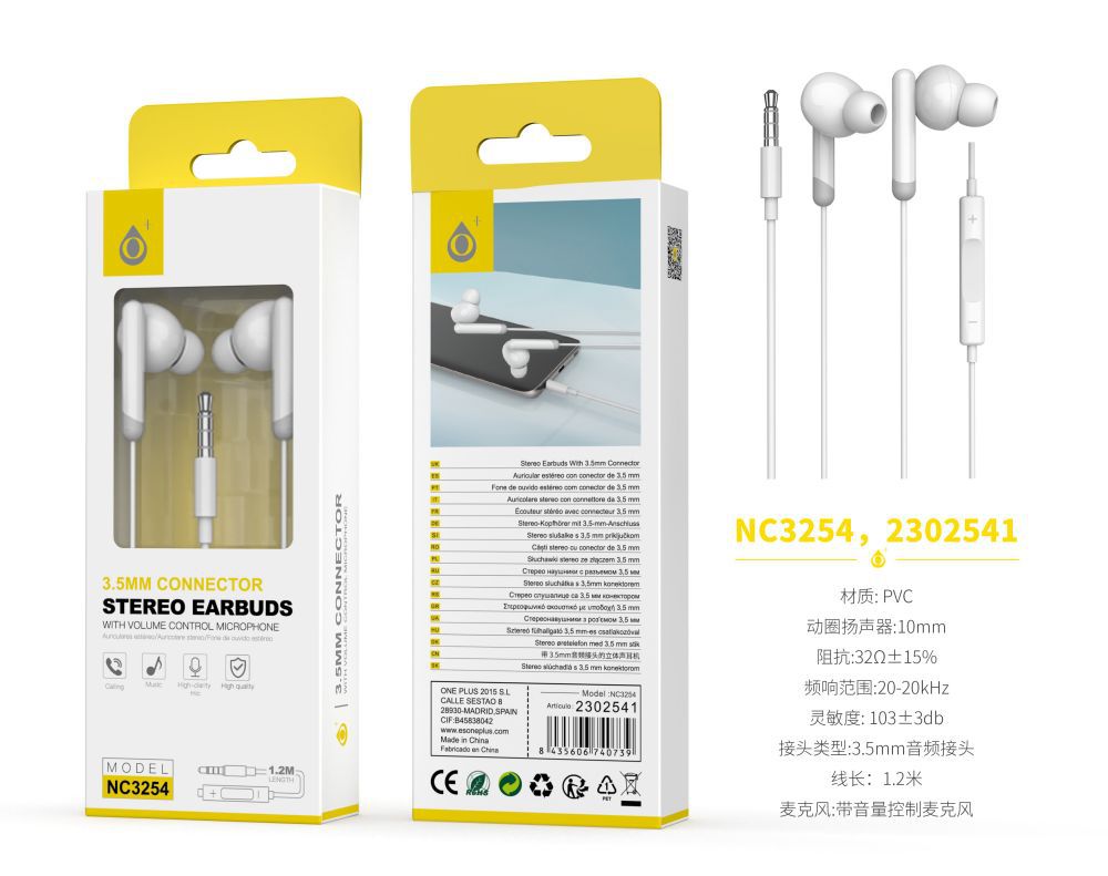 NC3254 BL Auricular Cort con Microfono y Control de Volumen, Soporta llamada y Musica, Cable 1.2m, Blanco