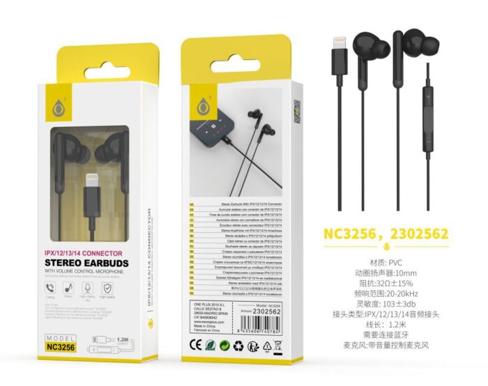 NC3256 NE Auricular Lightning Cort con Microfono y  Control de Volumen, (Necesario Activar Bluetooth) Soporta llamada y Musica, Cable 1.2m, Negro