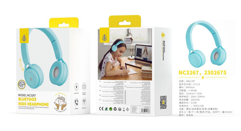 NC3267 AZ Auriculares Casco Bluetooth 5.0 Para Ninos con microfono y Botones Multifunciones, Soporta Tarjeta TF(64G), Bateria 200mAh, Azul