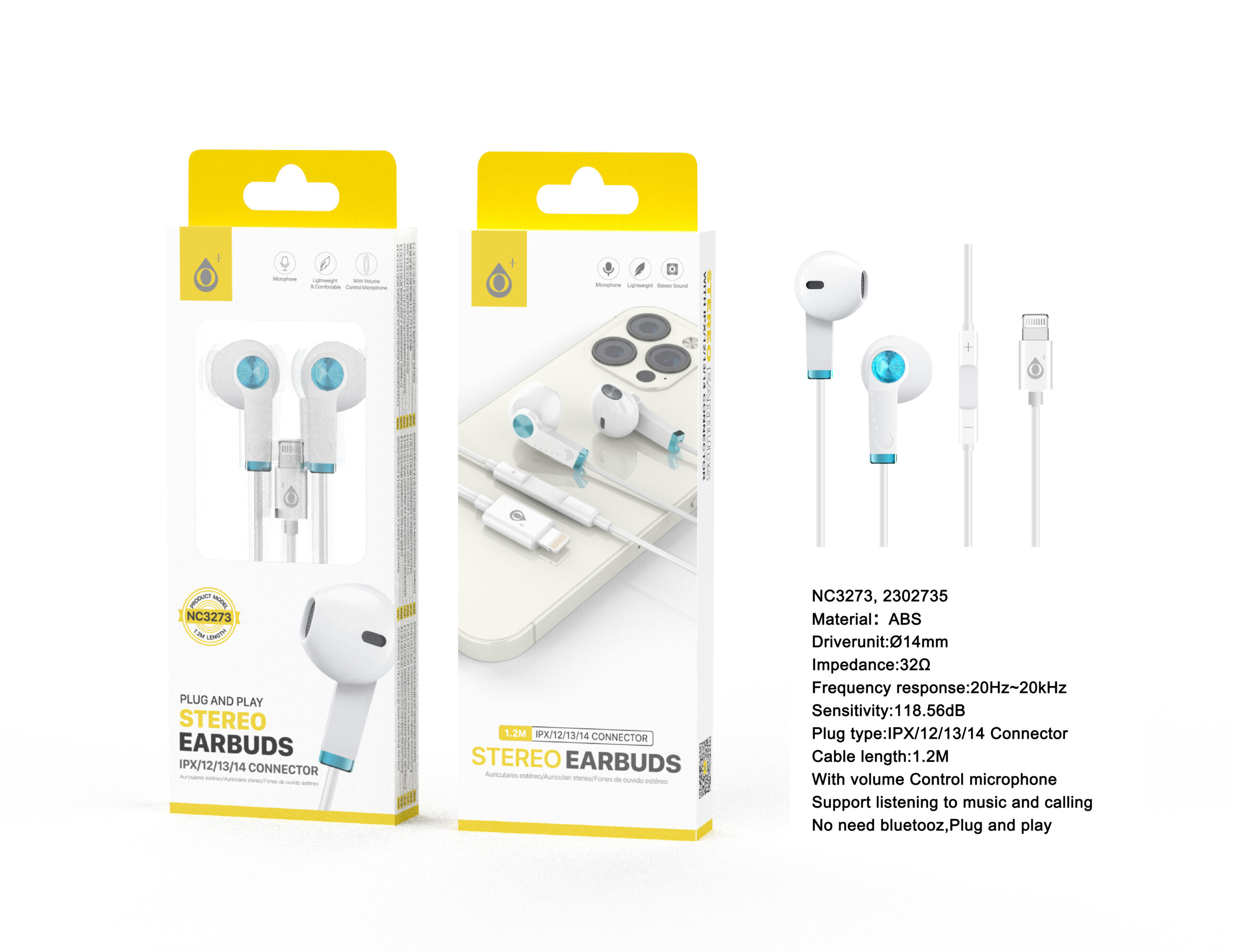 • NC3273 Auriculares Lightning Levi con Microfono y Boton multifuncion, para Iphone 5-14,Plug and Play, Cable 1.2M, Blanco+Azul