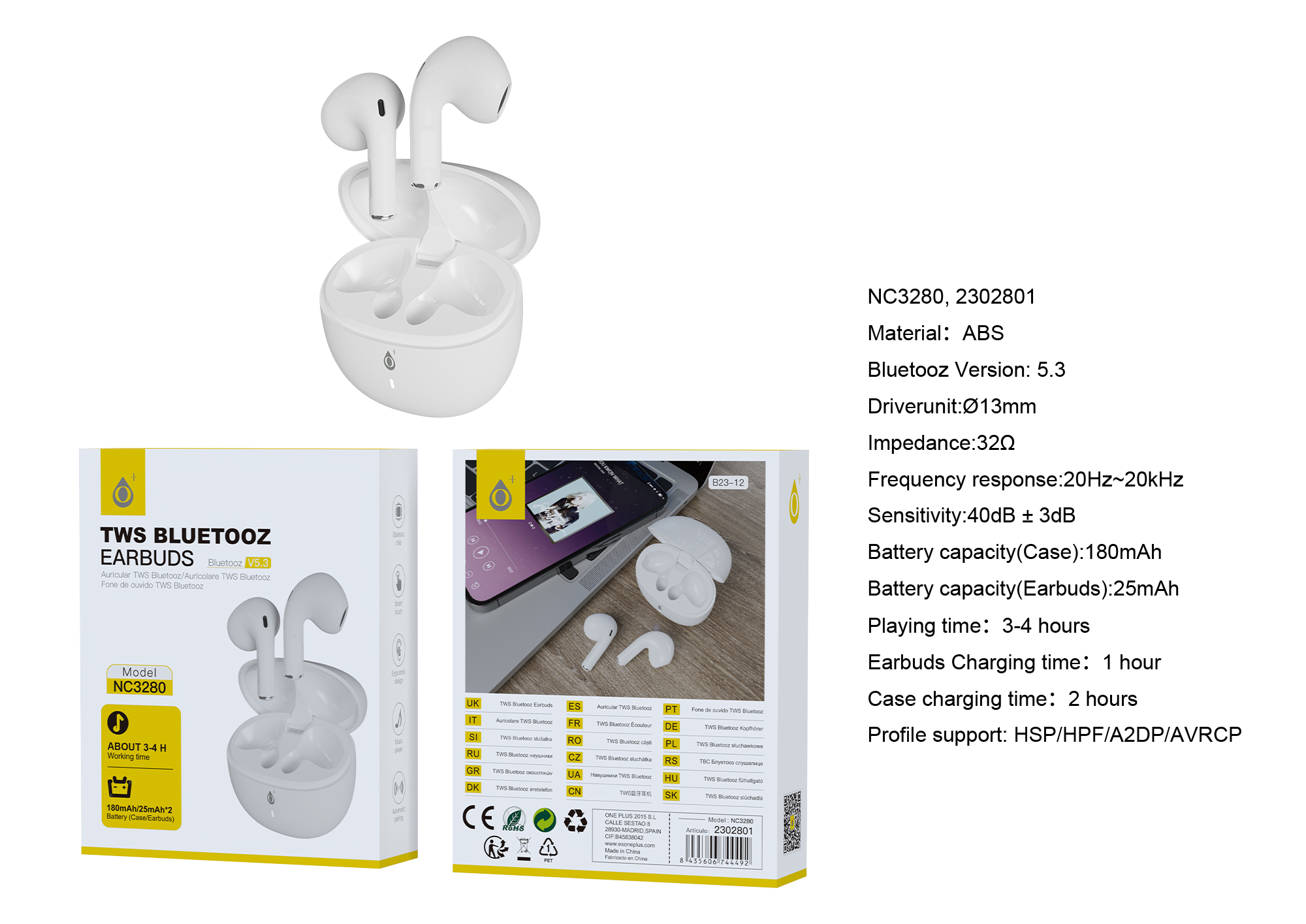 NC3280 BL Auriculares TWS Bluetooth 5.3, Bateria (25mAh*2)Con Estuche Recargable 230mAh, Blanco