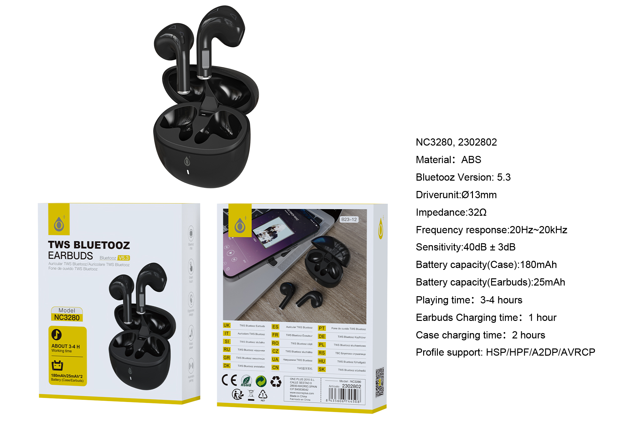 NC3280 NE  Auriculares TWS Bluetooth 5.3, Bateria (25mAh*2)Con Estuche Recargable 180mAh, Negro