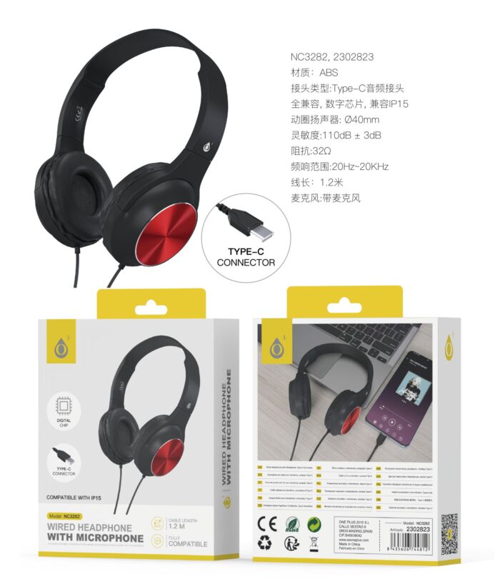 NC3282 NE+RJ Auriculares Casco Ilaria con Cable Type-C y Microfono, 1.2m, Compatible con Apple, Negro+Rojo