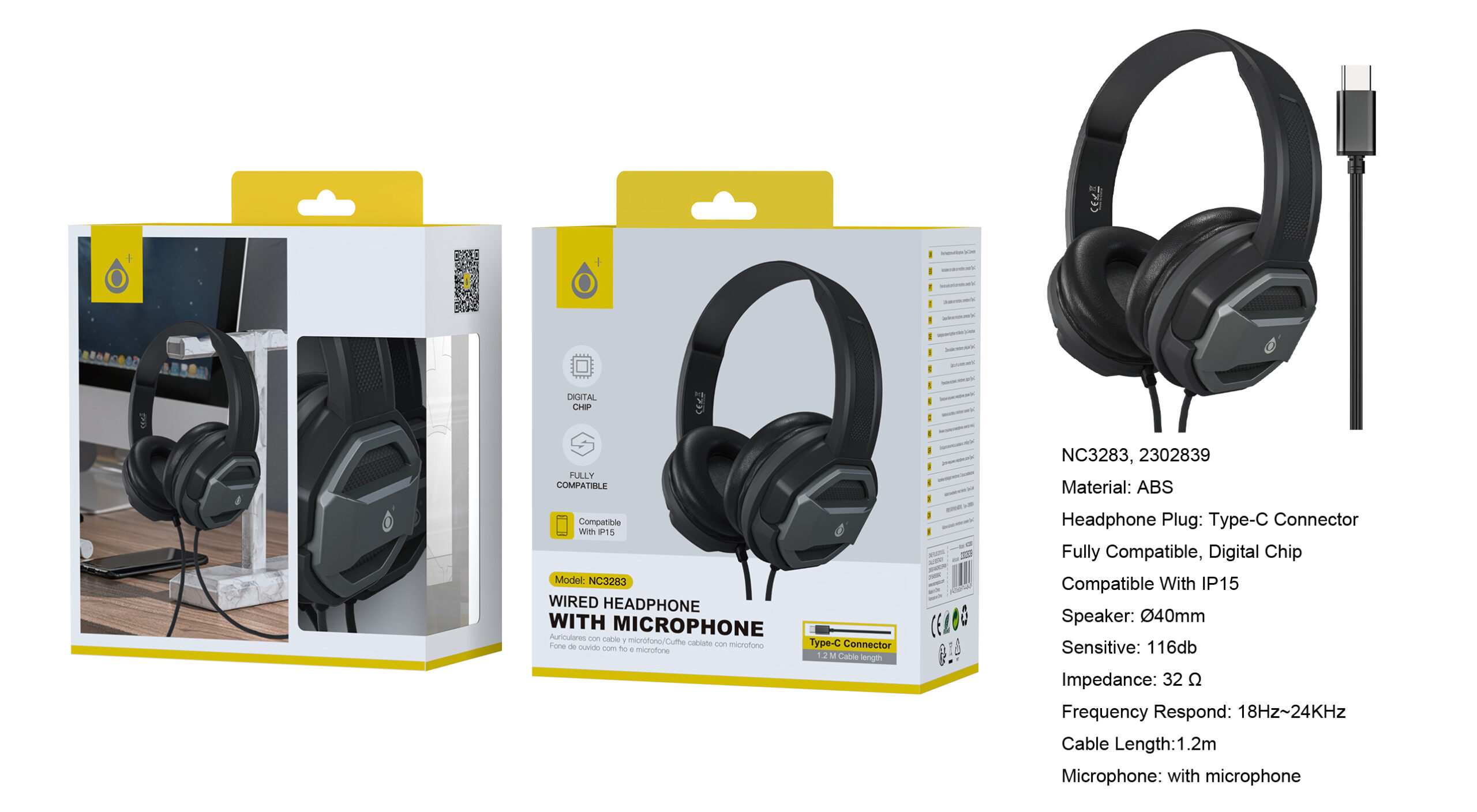 NC3283 GR Auriculares Casco Volker con Cable Type-C y microfono, Cable 1.2m, Gris