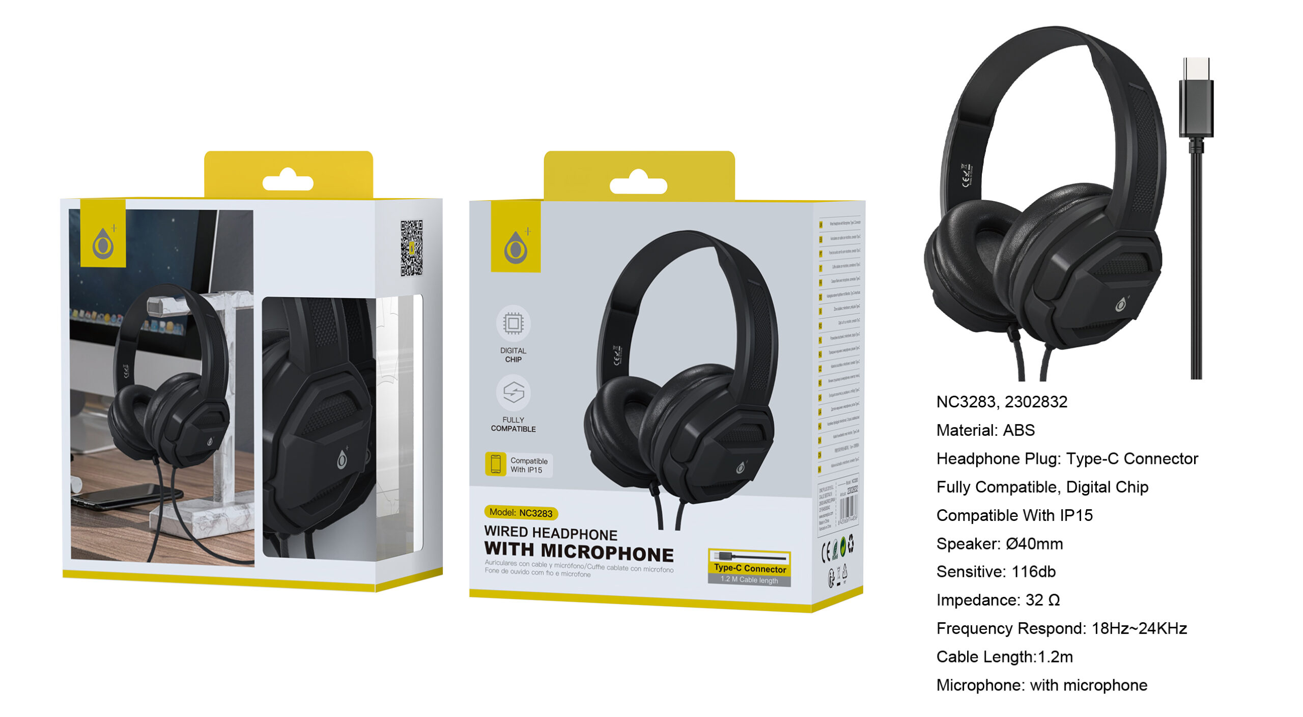NC3283 NE Auriculares Casco Volker con Cable Type-C y microfono, Cable 1.2m, Negro