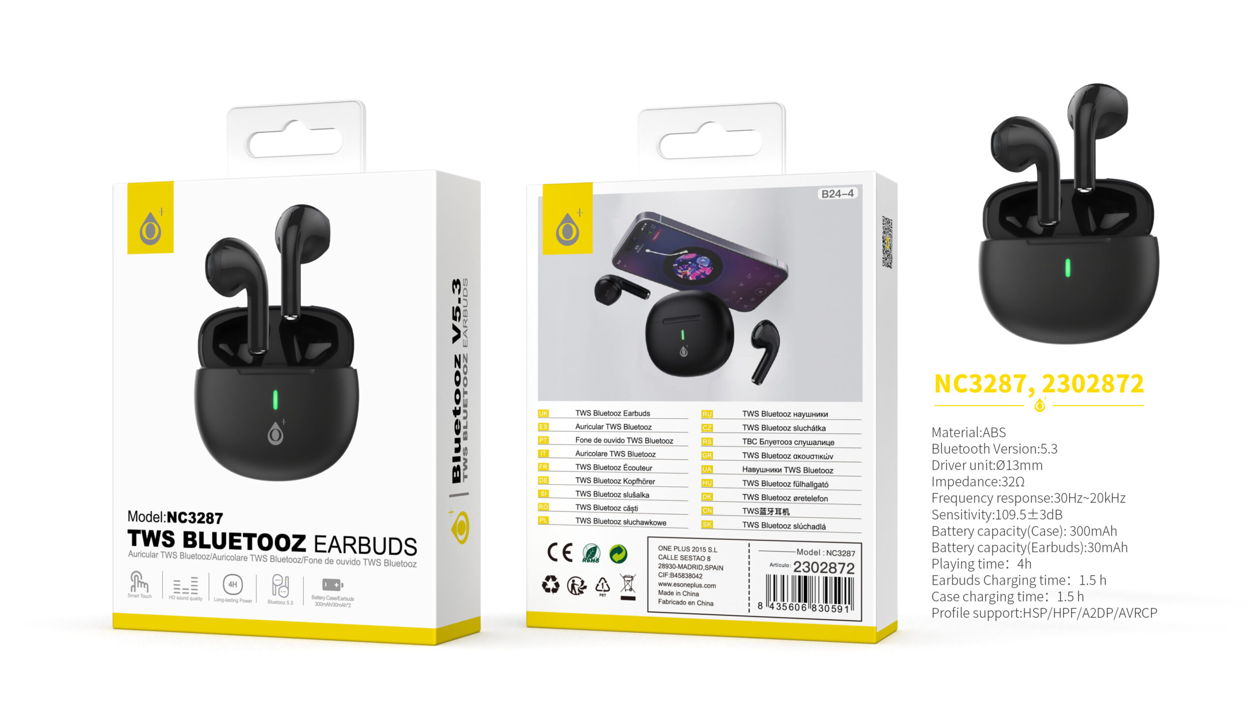 • NC3234 NE Auriculares TWS Bluetooth 5.3 Bateria (25mAh*2) con estuche cargable(230mAh), Negro