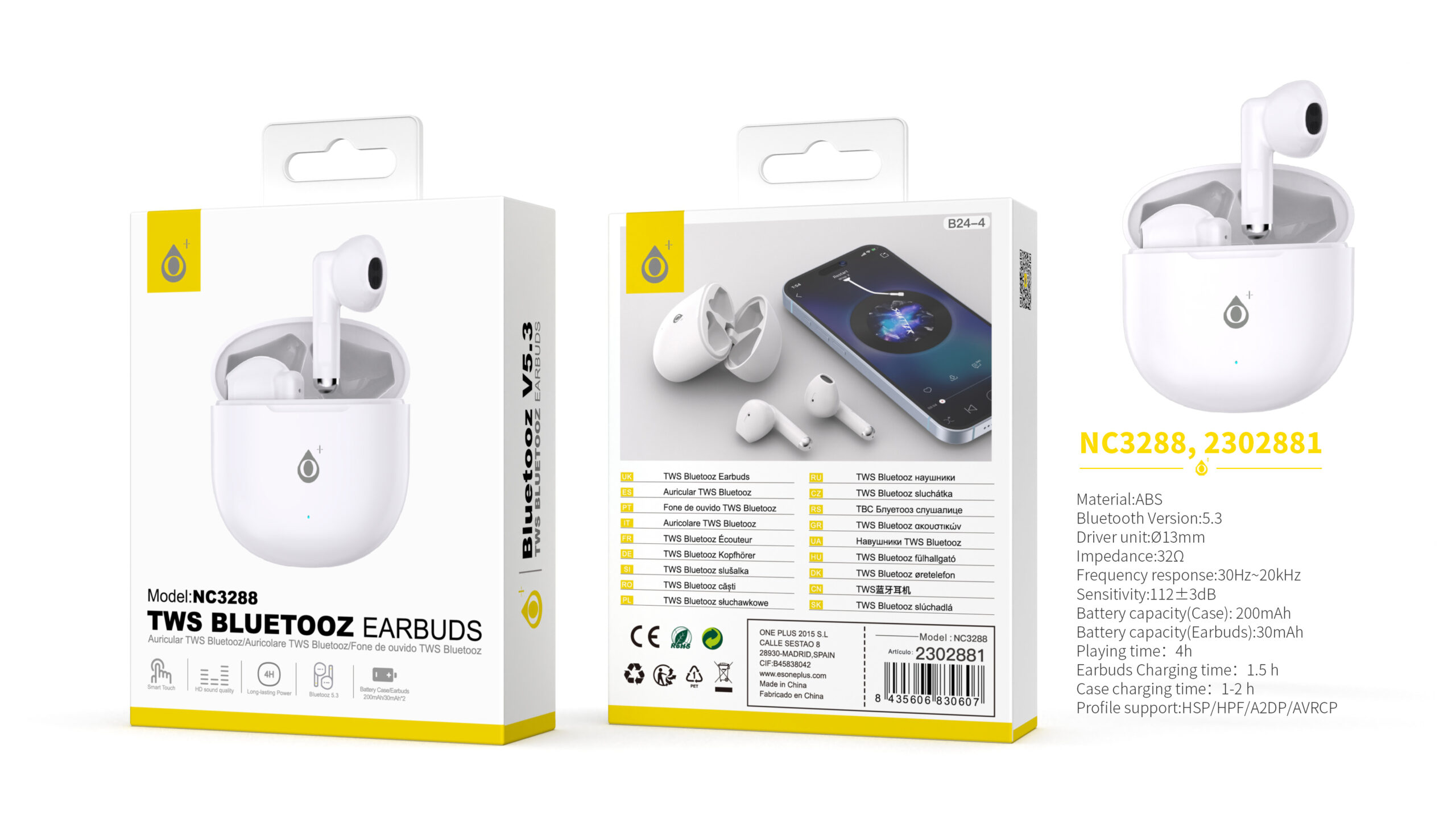NC3288 BL Auriculares TWS Bluetooth 5.3, Bateria (30mAh*2)Con Estuche Recargable 200mAh, Blanco