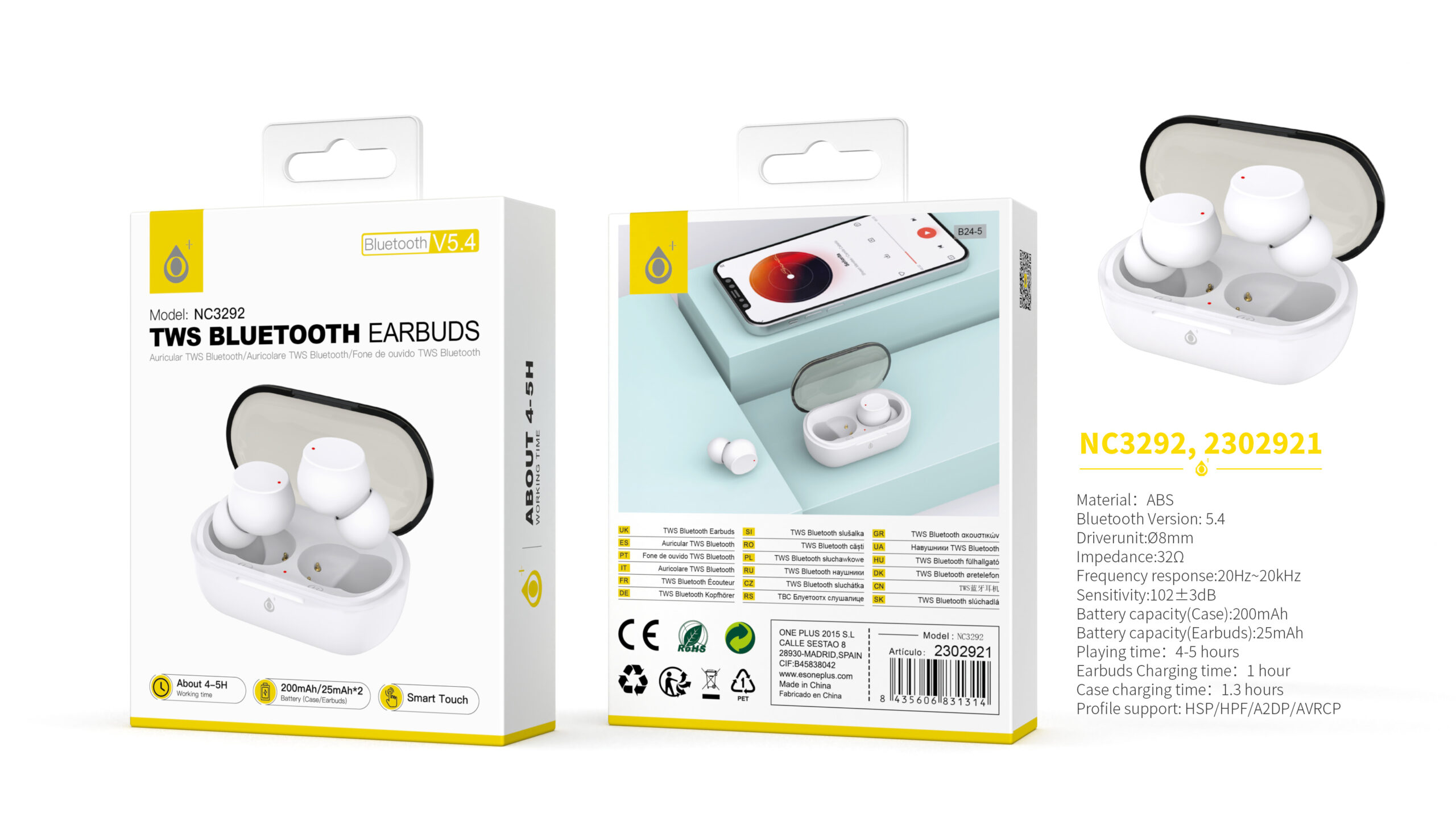 NC3292 BL Auriculares TWS Bluetooth 5.4, Bateria (25mAh*2)Con Estuche Recargable 200mAh, Blanco