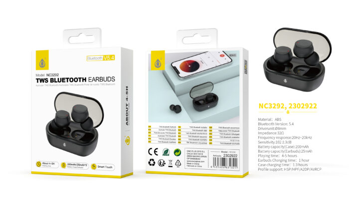 NC3292 NE Auriculares TWS Bluetooth 5.4, Bateria (25mAh*2)Con Estuche Recargable 200mAh, Negro