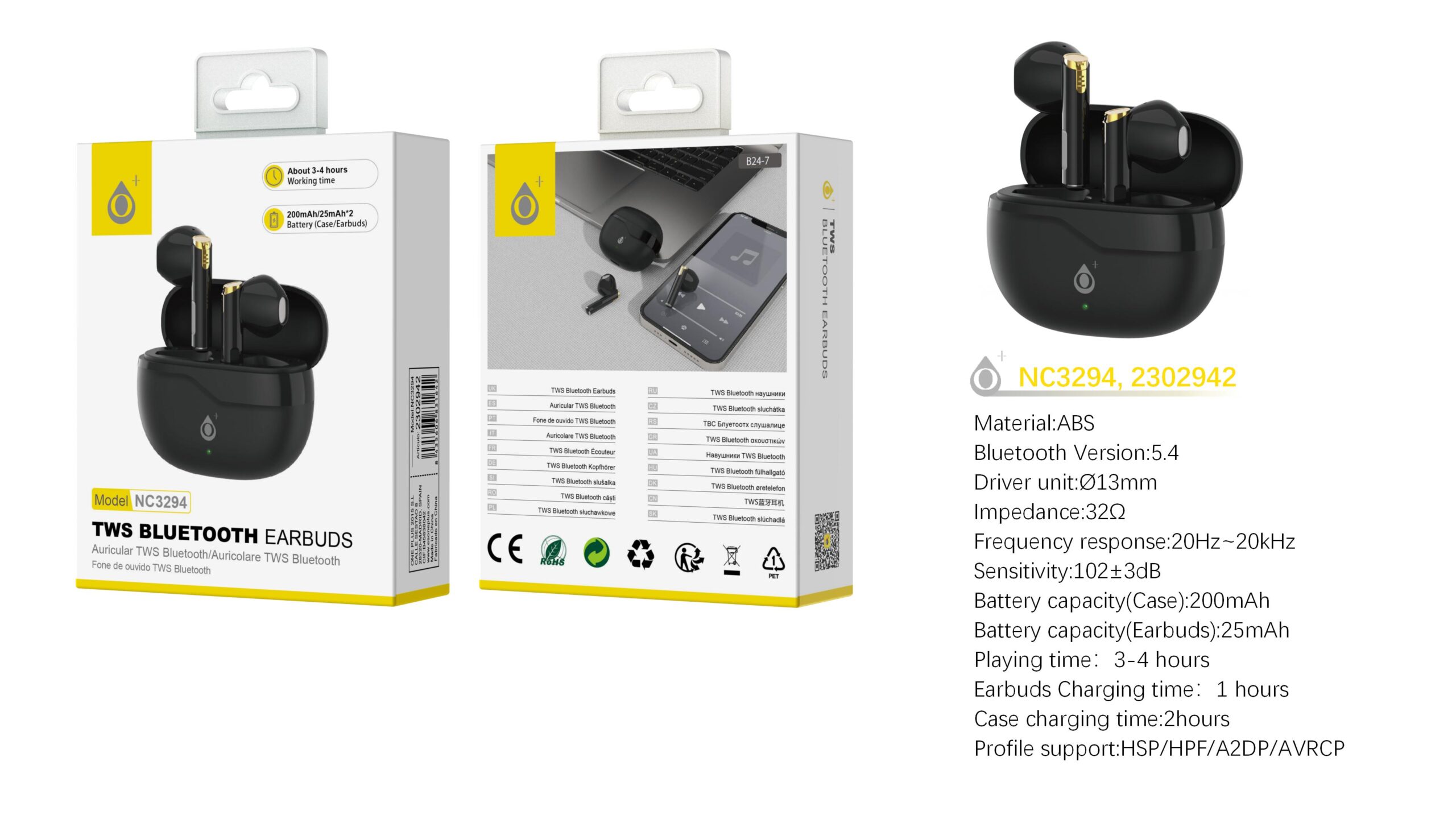 NC3294 NE Auriculares TWS Bluetooth 5.4  Bateria (25mAh*2) con estuche cargable(200mAh), Negro