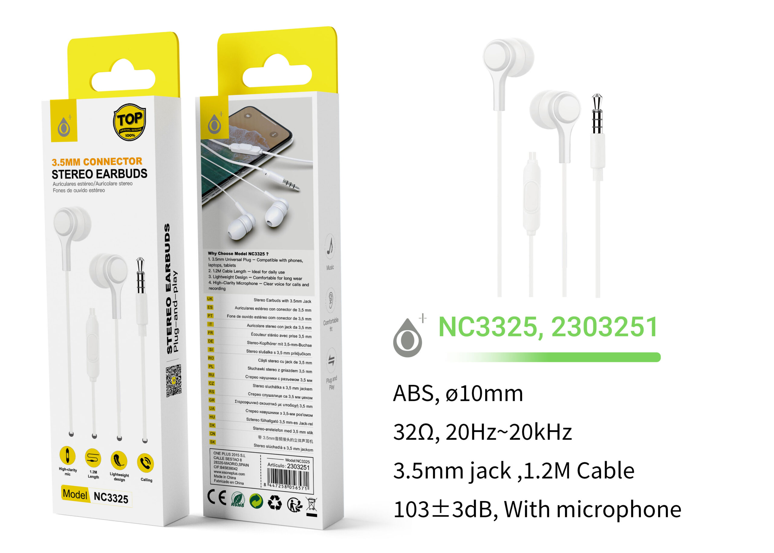 • NC3173 BL Auriculares con Microfono de alta calidad Namdi,Boton Multifuncion y Control Volumen, Longitud 1.16M,Blanco