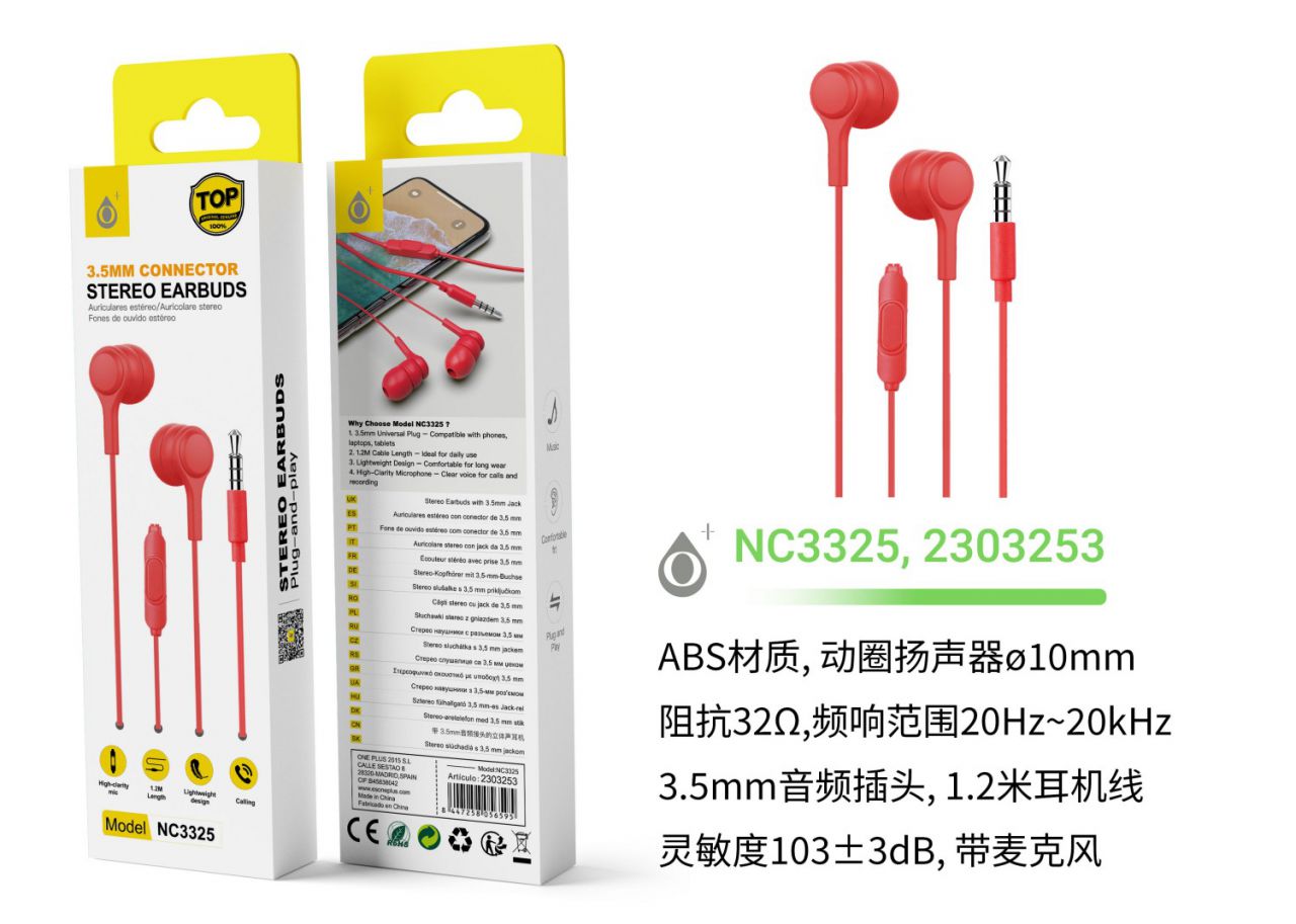 • NC3189 RS Auriculares Ava ,con Microfono, Soporta Control de Volumen y Boton multifunciones, 1.2m,
