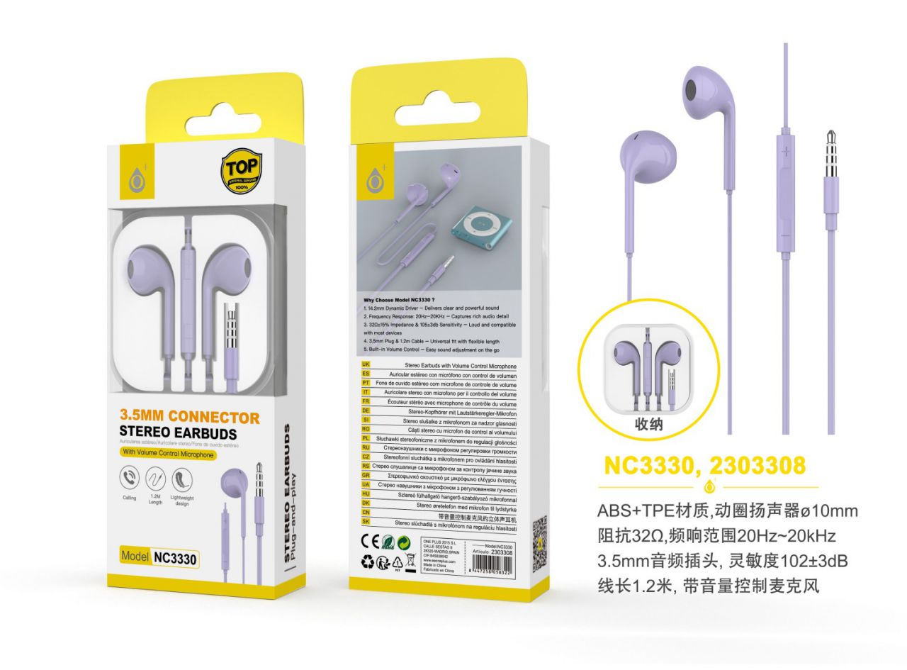 NC3330 MR Auricular Cavi con microfono y boton de volumen, Cable 1.2M, Morado